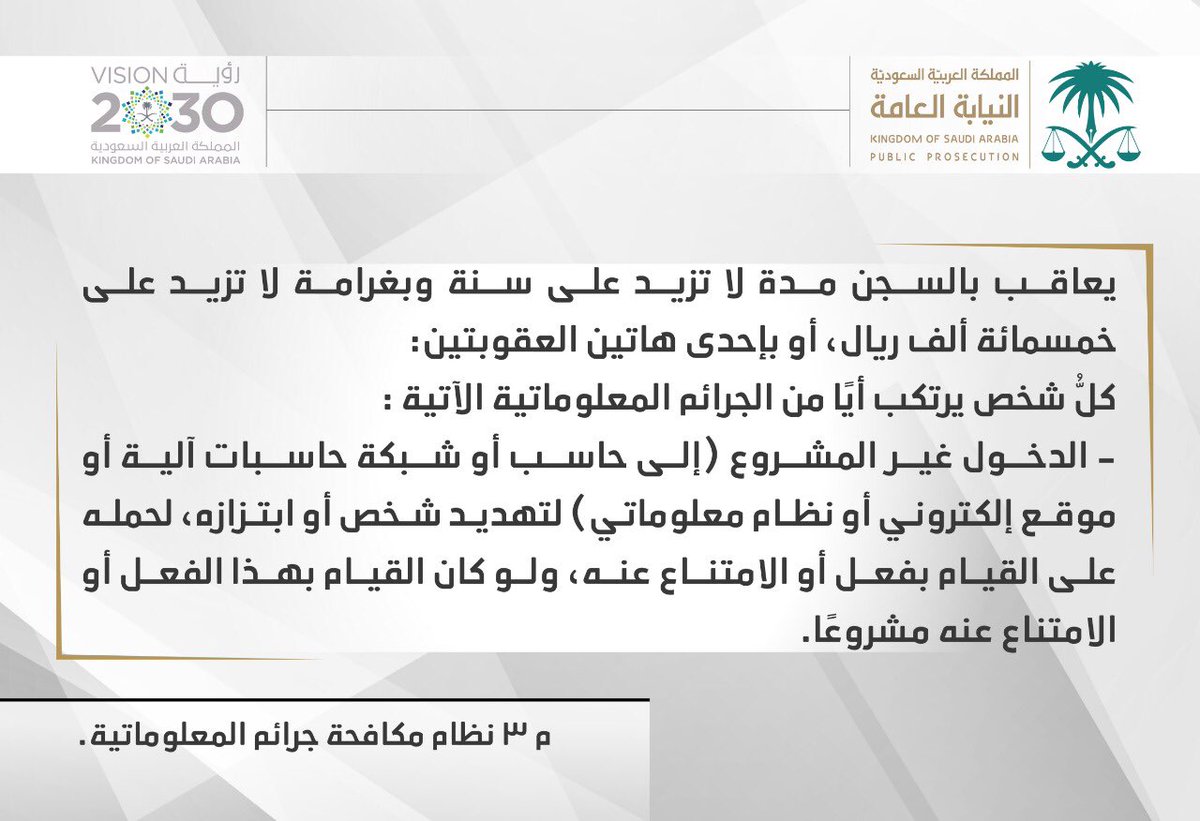 وأكدت النيابة أن هذه الفعلة جريمة معلوماتية يعاقب مرتكبها بالسجن مدة تصل إلى سنة وبغرامة تصل إلى 500 ألف ريال.