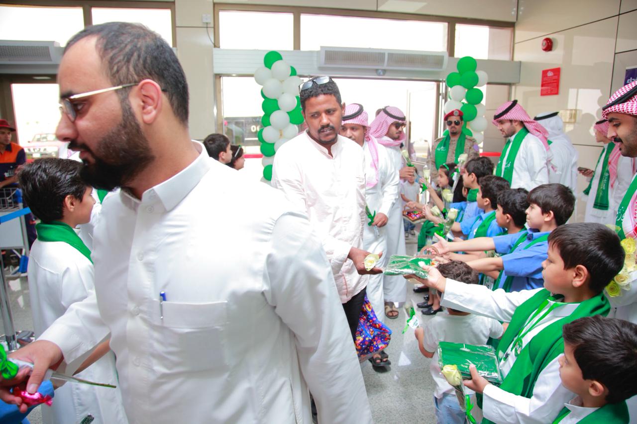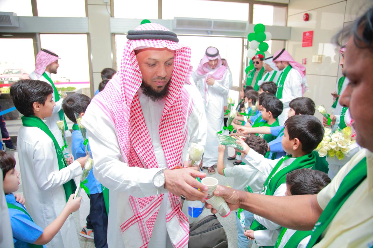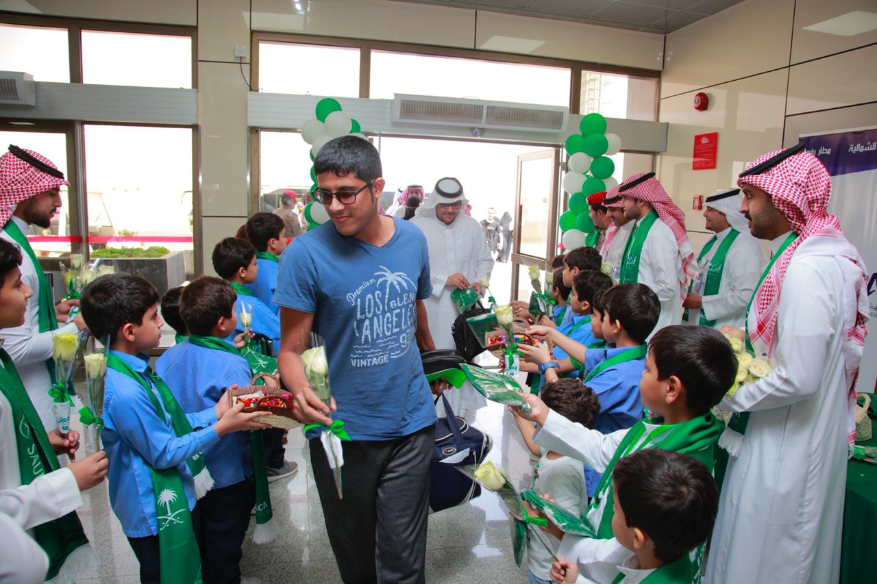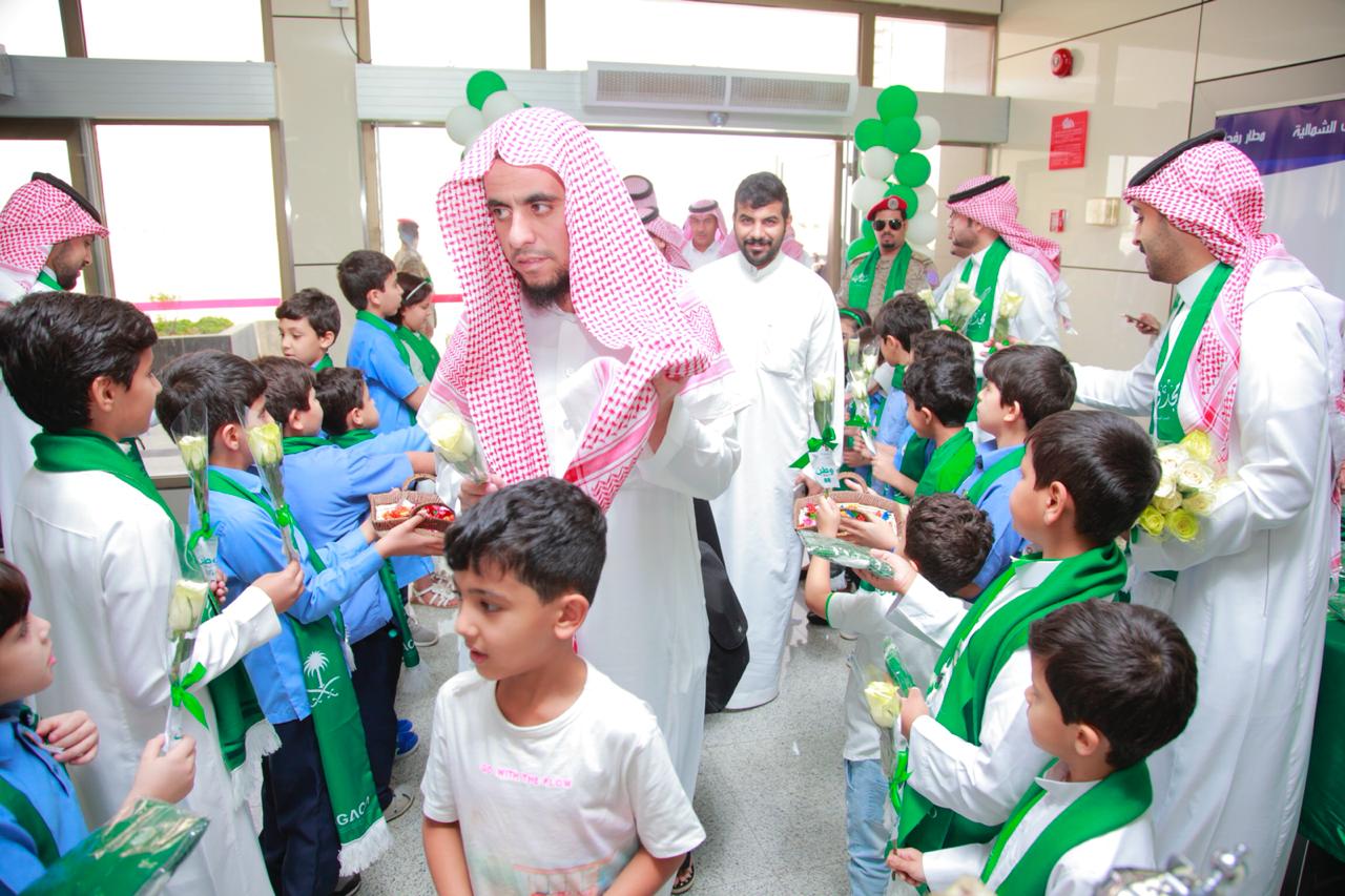 وشارك في استقبال المسافرين طلاب مدرسة الثراء العلمي برفحاء بمعية مديرهم فيصل بن فهد الحريري.