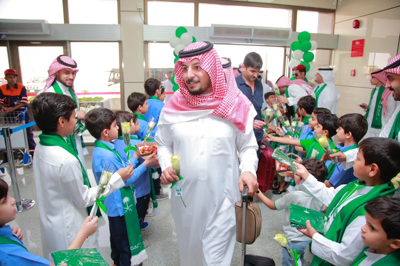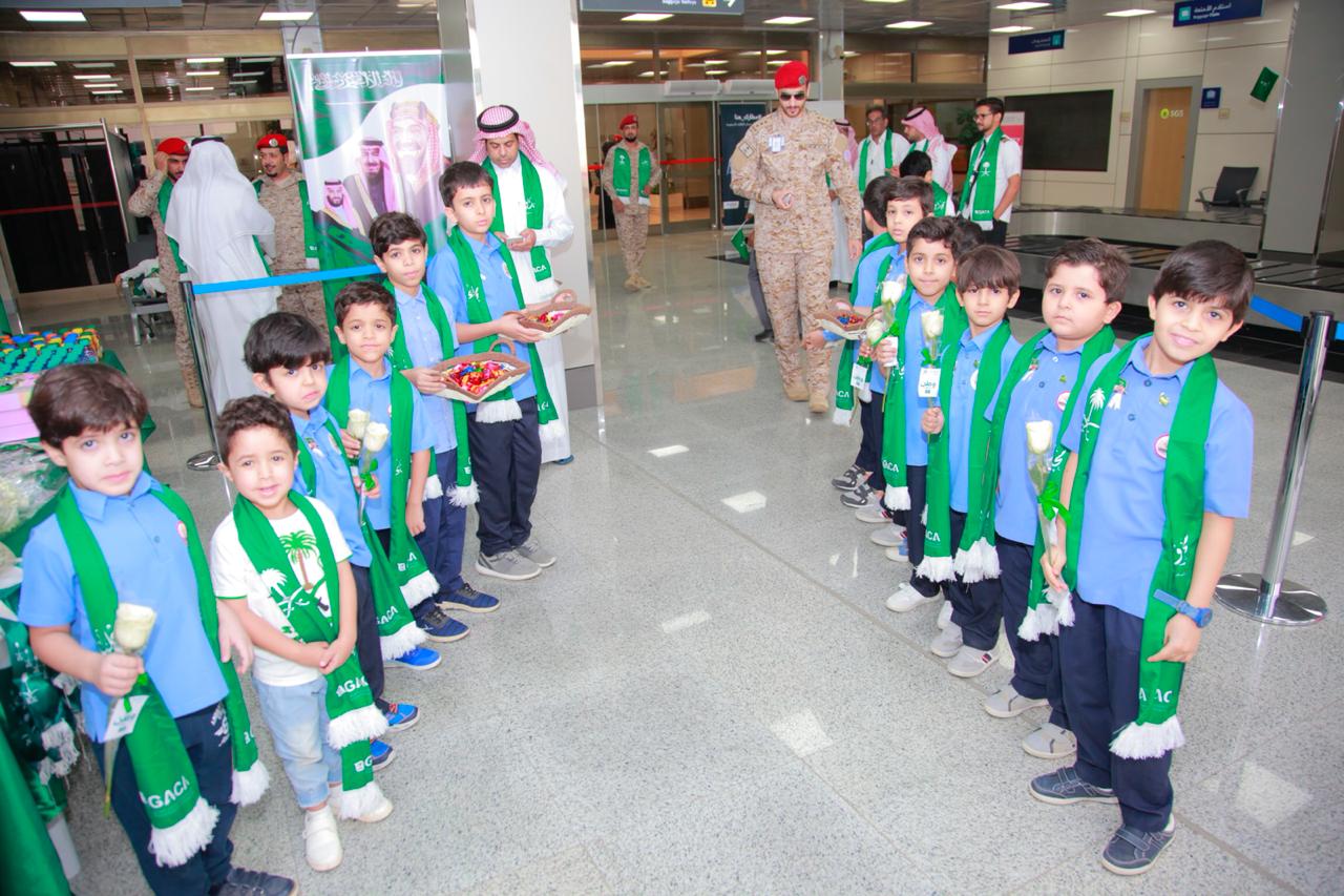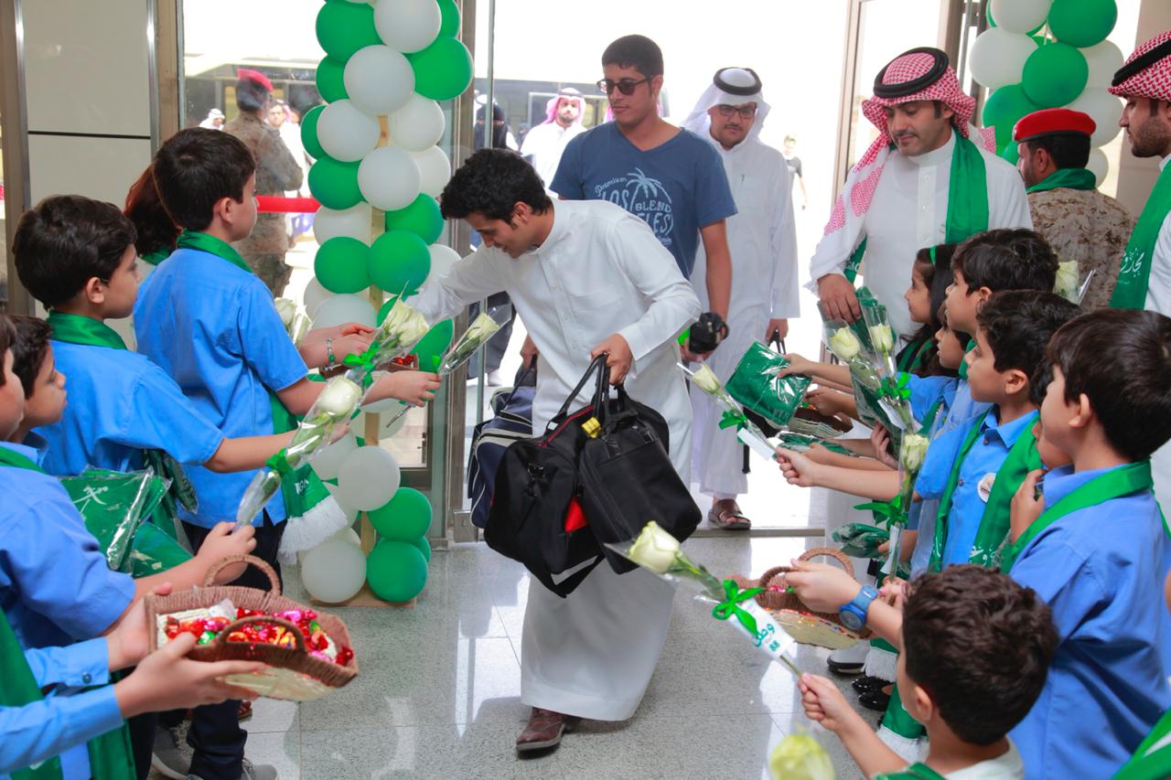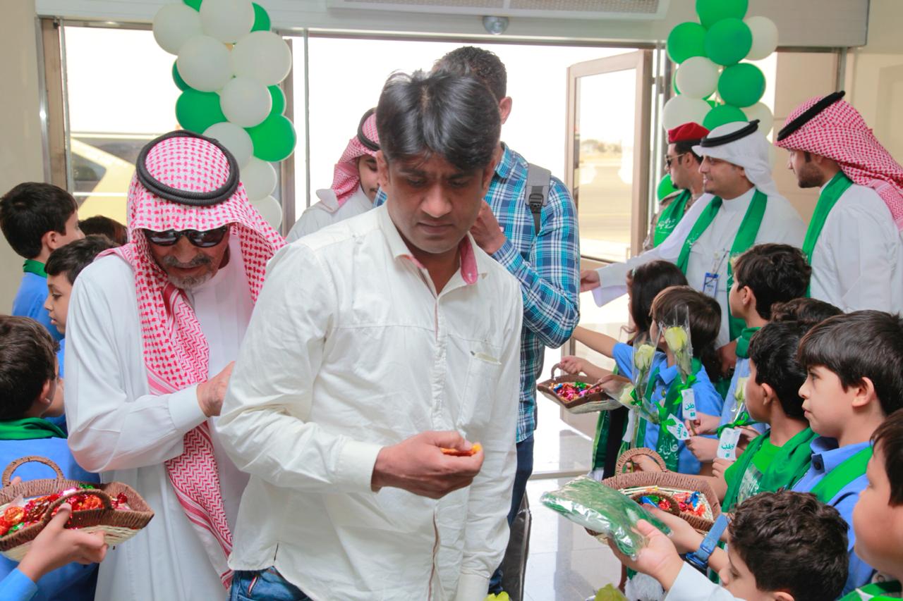 وشارك في استقبال المسافرين طلاب مدرسة الثراء العلمي برفحاء بمعية مديرهم فيصل بن فهد الحريري.