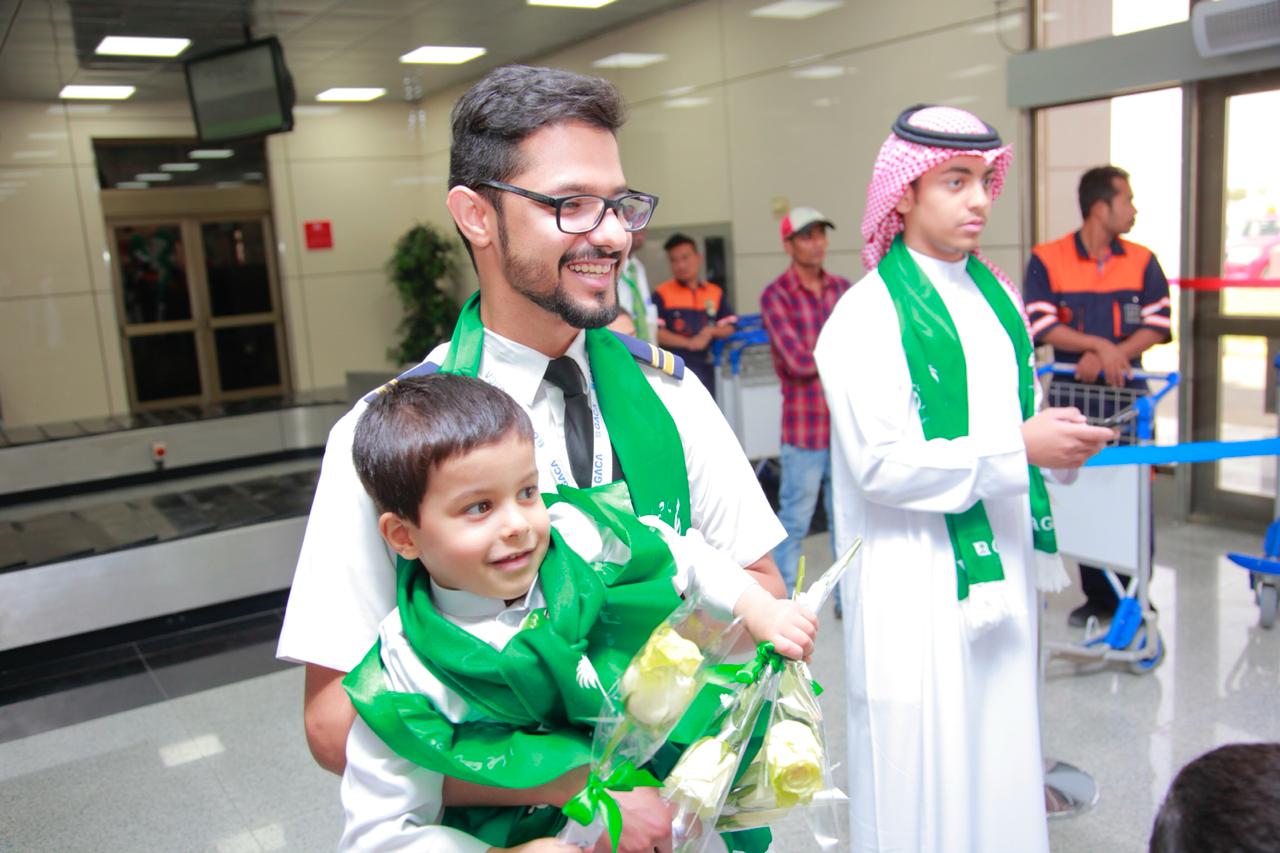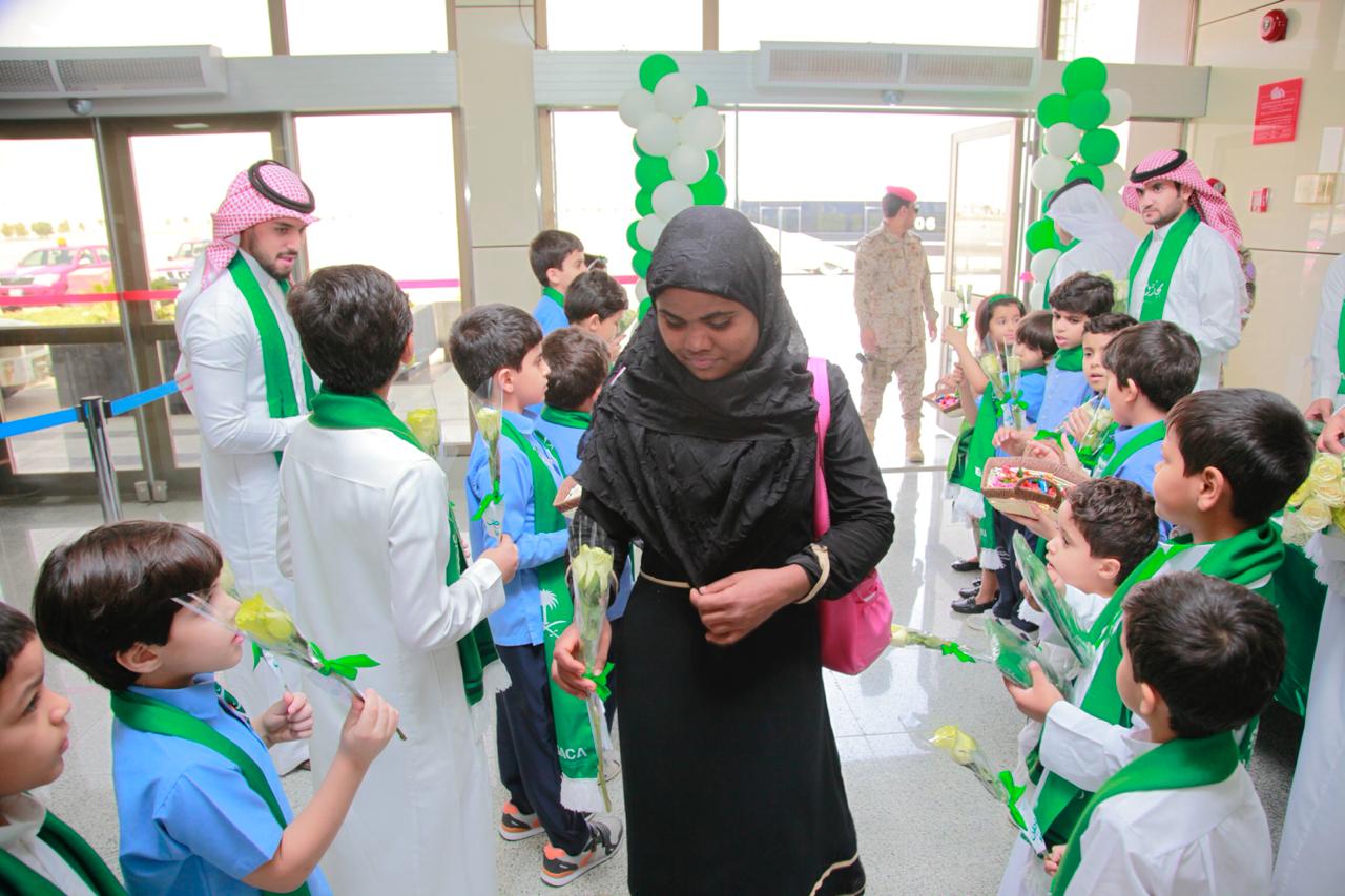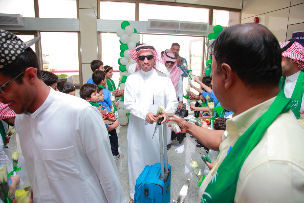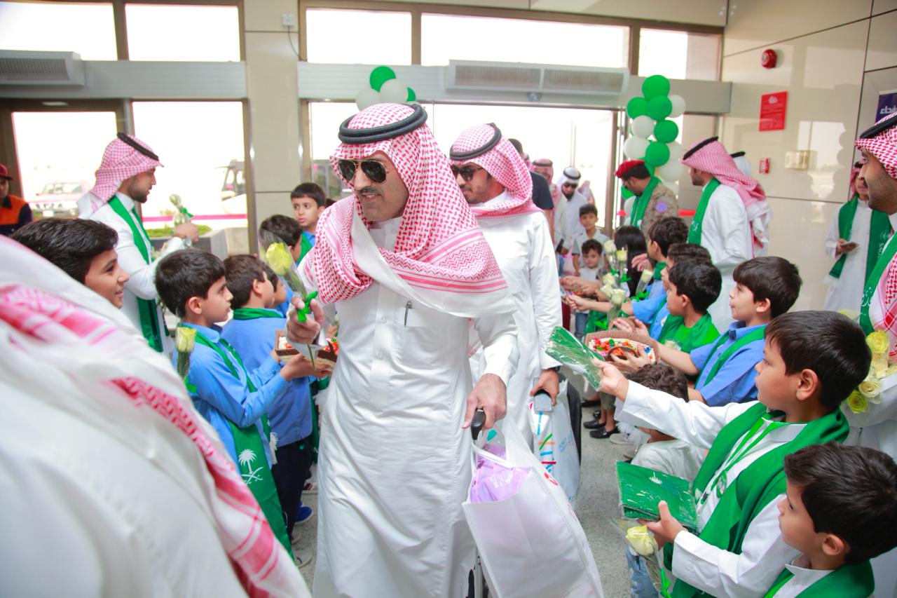 وشارك في استقبال المسافرين طلاب مدرسة الثراء العلمي برفحاء بمعية مديرهم فيصل بن فهد الحريري.