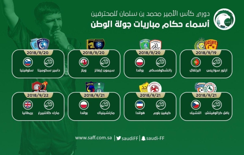 وأعلن الاتحاد السعودي لكرة القدم، عن حُكام مباريات جولة الوطن من كأس دوري الأمير محمد بن سلمان للمحترفين، حيث سيدير البرتغالي آرتور سواريس مباراة القادسية ضد النصر، التي ستُقام، مساء اليوم الأربعاء.
