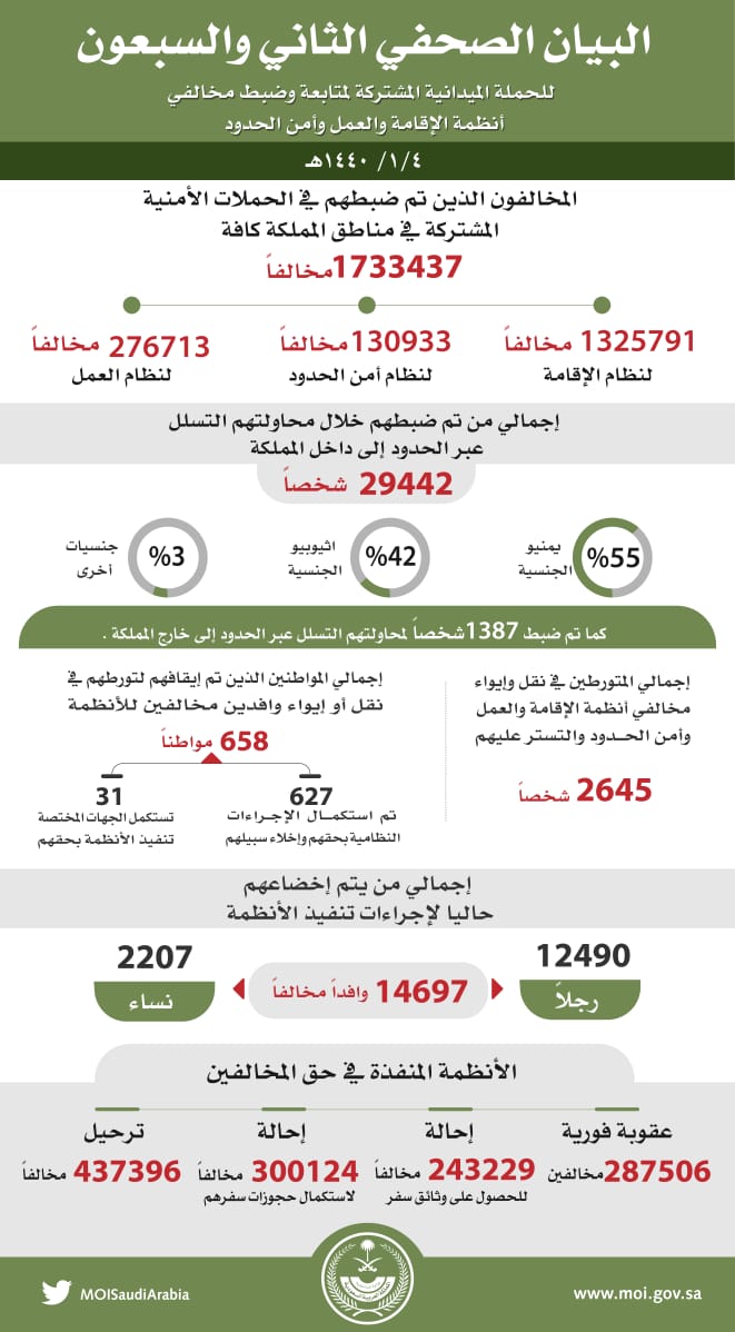 أسفرت الحملات الميدانية المشتركة التي انطلقت يوم الأربعاء الموافق 26 / 2 / 1439هـ وحتى نهاية يوم الخميس 3 / 1 / 1440هـ لتعقب وضبط مخالفي أنظمة الإقامة والعمل وأمن الحدود التي تمت في كافة مناطق المملكة عن النتائج التالية: –