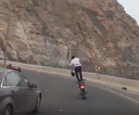 وثق مقطع فيديو شابًّا يقود دراجة نارية على طريق الھدا، وھو واقف عليھا ويؤدي استعراضات خطيرة تهدد حياته وحياة المارة.