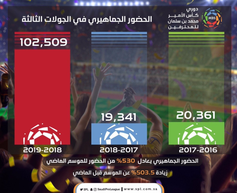 وجاء عدد الحضور الجماهيري في الجولة الثالثة من الدوري السعودي للمحترفين موسم 2016/ 2017، 20 ألف و361 متفرجًا، وفي الموسم التالي، بلغ عدد الجمهور 19 ألف و341 متفرجًا، فيما وصلت أعداد الجماهير هذا الموسم لـ102 ألف و509 متفرجًا.