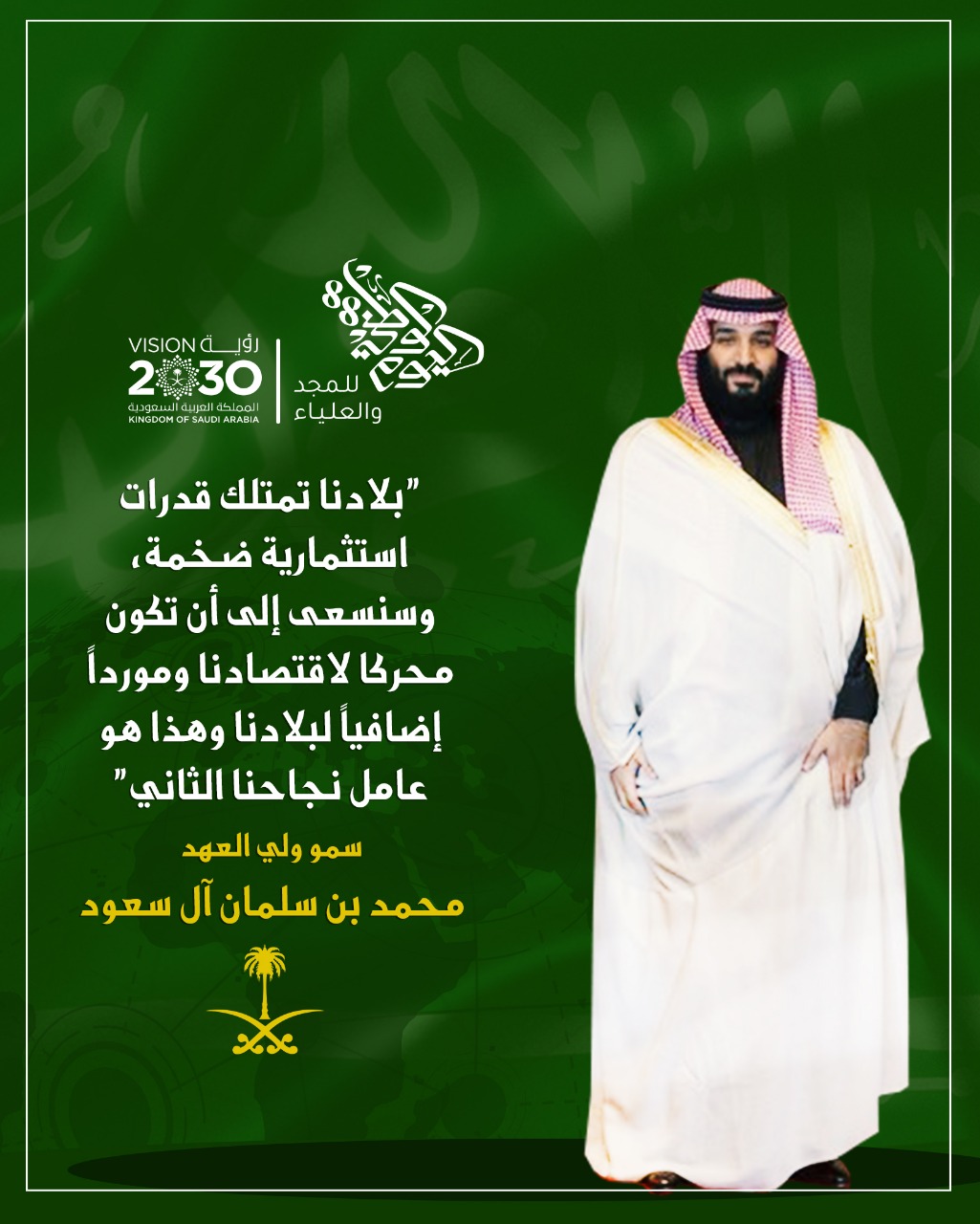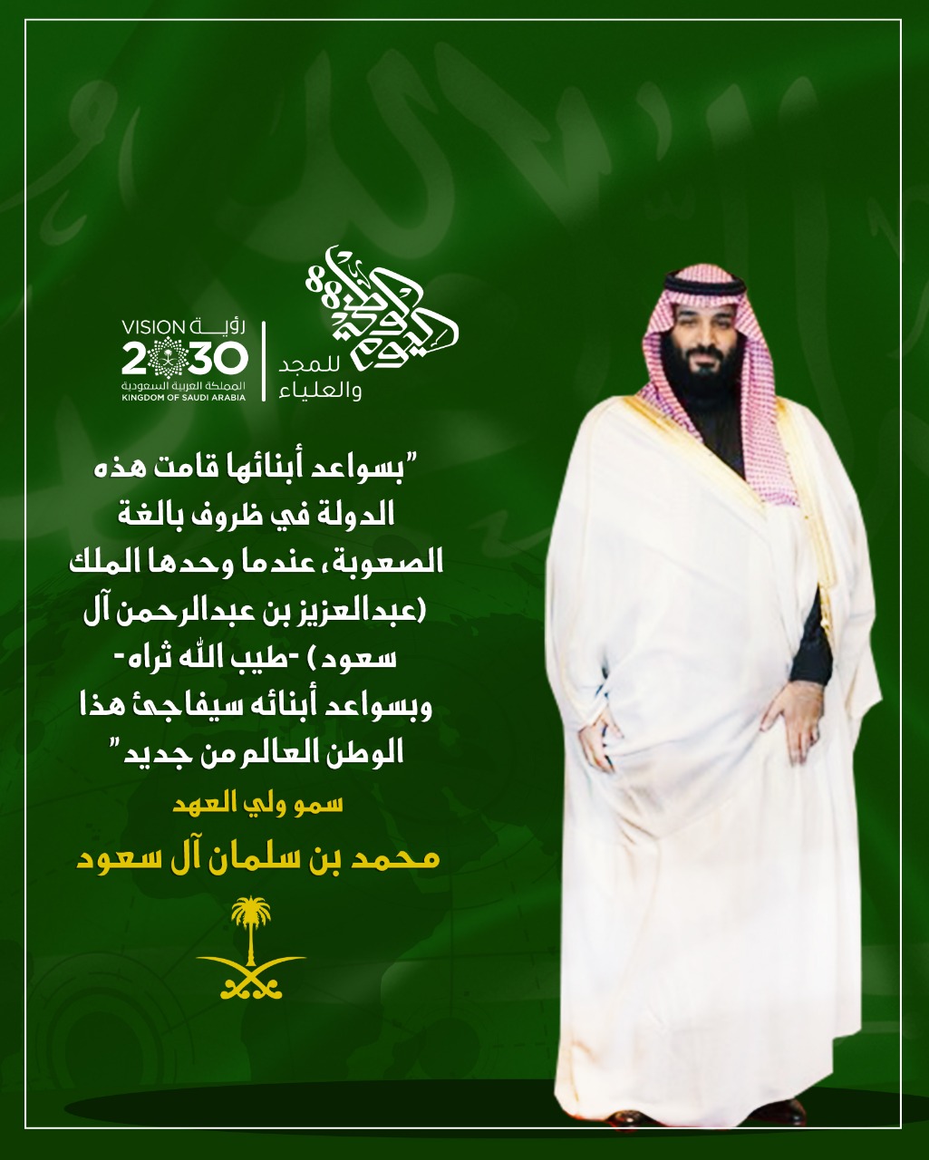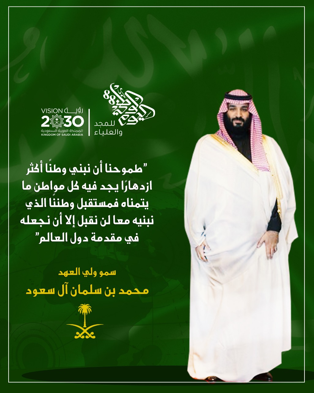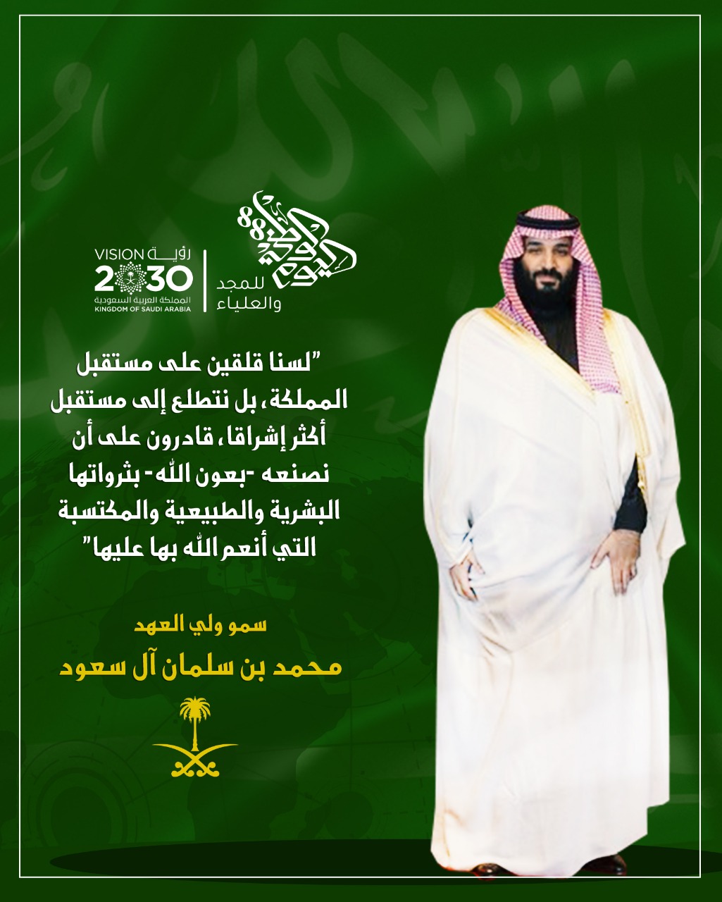 في ذكرى اليوم الوطني الـ88 للمملكة نستذكر كلمات ولي العهد الأمير محمد بن سلمان، تجاه الوطن والمواطن، والتي تجسد رؤية وطن وحلم أمة تطمح لبلوغ عنان السماء في الرقي والتقدم والازدهار.