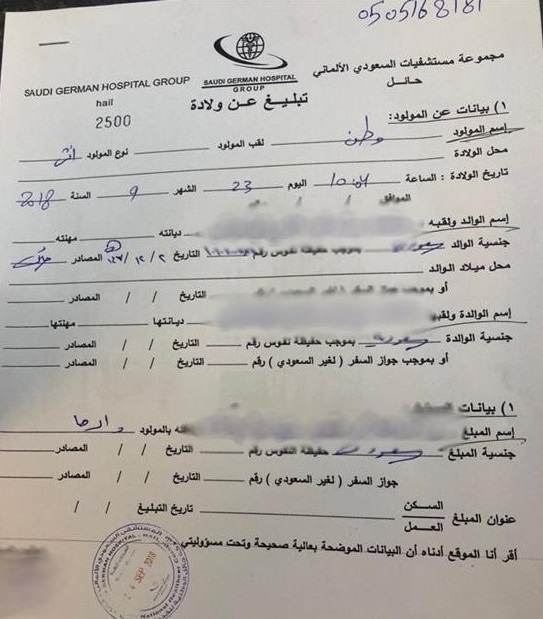 ووثق صورة متداولة عبر مواقع التواصل صورة للطفلة حديثة الولادة وصورة من بلاغ الولادة الصادر من أحد مستشفیات حائل.