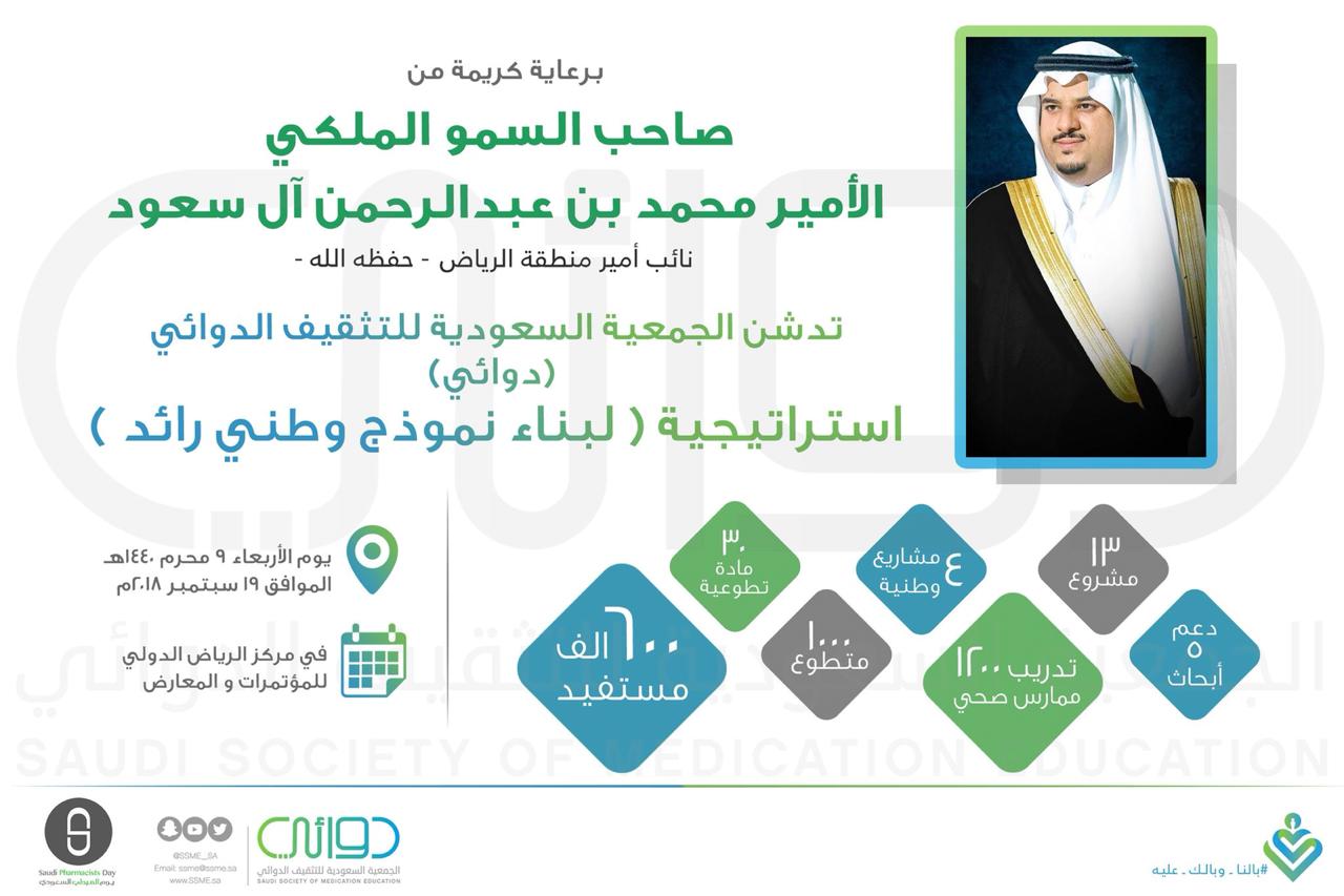 نيابة عن صاحب السمو الملكي الأمير محمد بن عبدالرحمن بن عبدالعزيز نائب أمير منطقة الرياض، دشن- مساء الأربعاء- معالي رئيس هيئة الغذاء والدواء الأستاذ دكتور هشام بن سعد الجضعي مشاريع الجمعية السعودية للتثقيف الدوائي (دوائي) والحملة الوطنية لتوعية بأدوية الأطفال، وبحضور عدد من الشخصيات البارزة بمركز الرياض الدولي للمؤتمرات والمعارض.