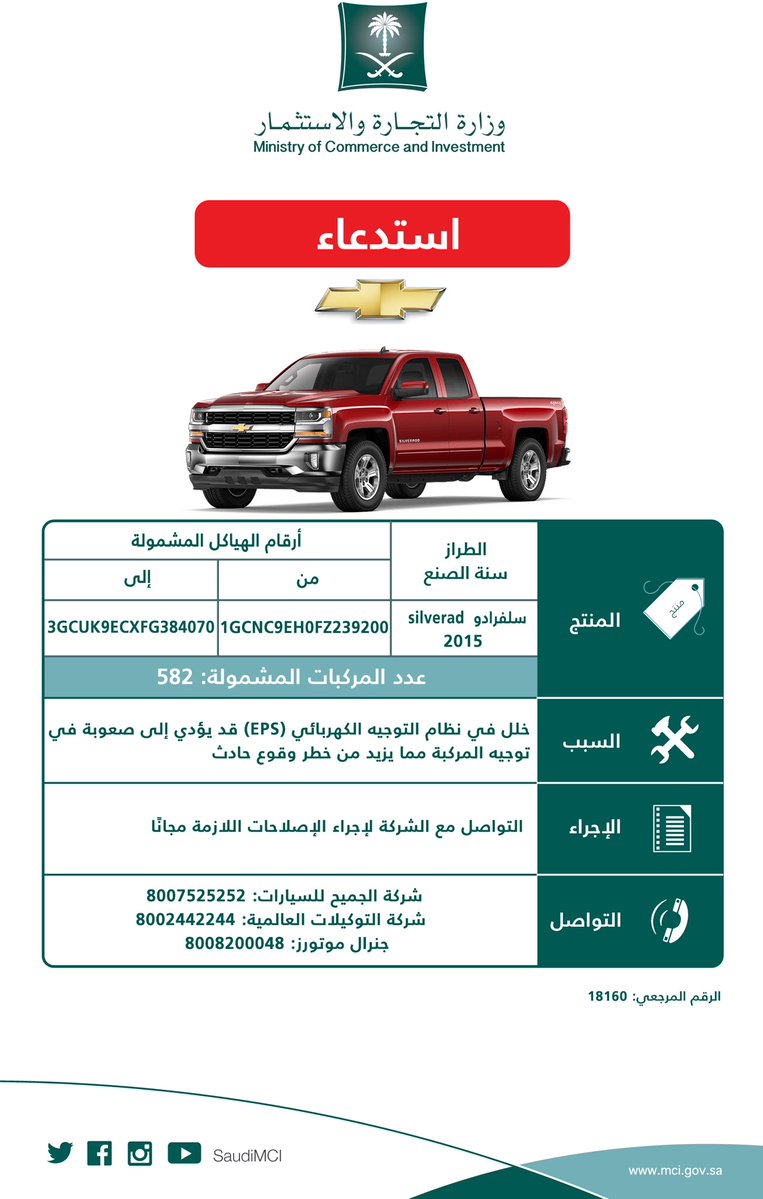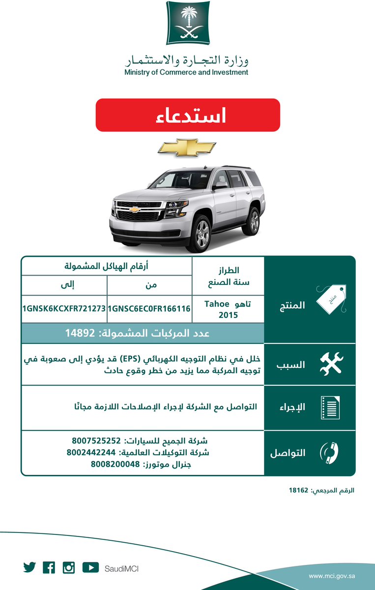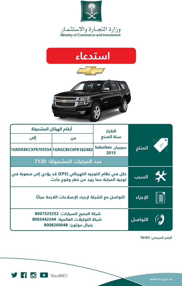 وبلغ عدد سیارات سوبربان المستدعاة، 7130 مركبة، و14892 مركبة تاھو، و582 مركبة سلفرادو، و10721 مركبة يوكن، و970 مركبة سكالید، و3505 مركبات سییرا ودعت الوزارة مالكي ھذا النوع من المركبات لمراجعة الوكلاء (شركة الجمیح للسیارات، شركة التوكیلات العالمیة، جنرال موتورز)؛ لإجراء الإصلاحات اللازمة مجاناً.