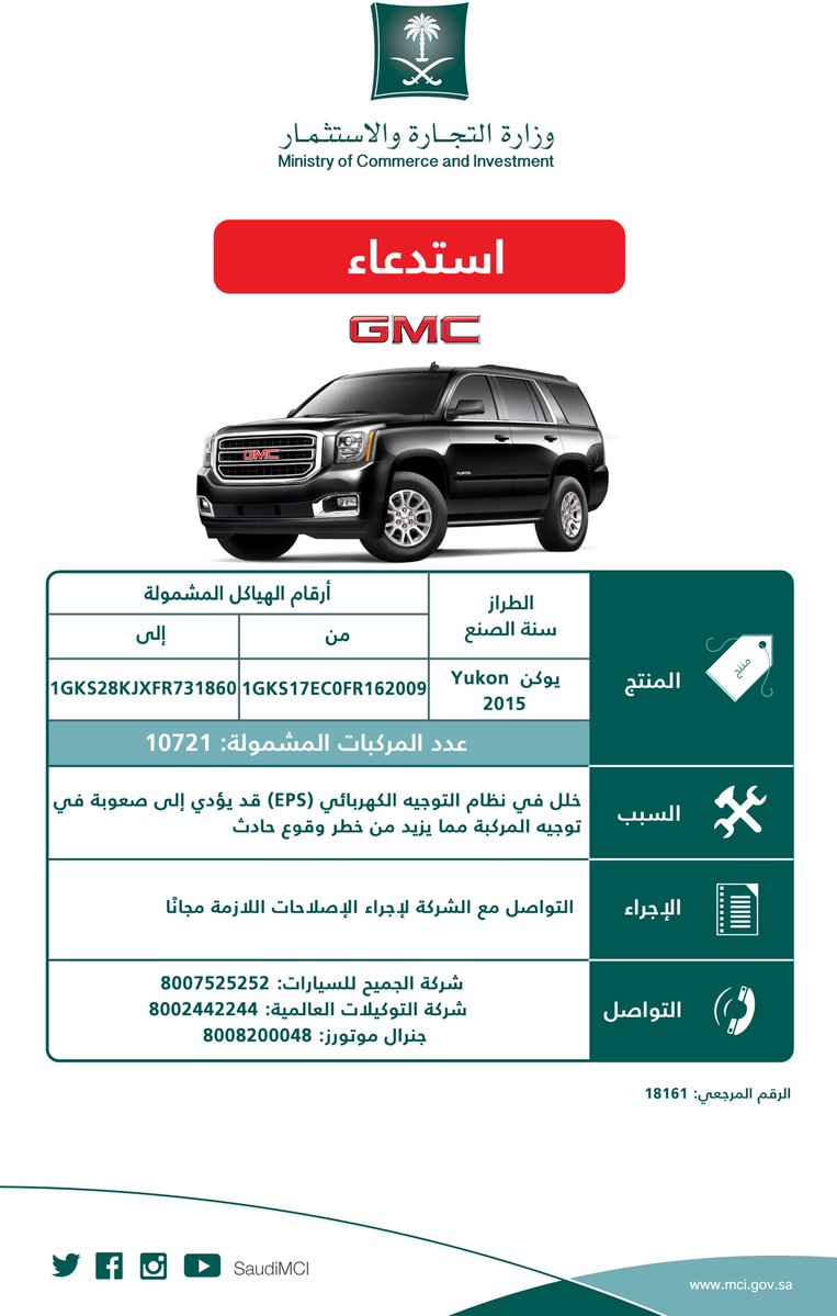 أعلنت وزارة التجارة والاستثمار استدعاء 8.37 ألف مركبة من جنرال موتورز (يوكن، سوبربان، تاھو، سلفرادو، اسكالید، سییرا)، جمیعھا موديل 2015.