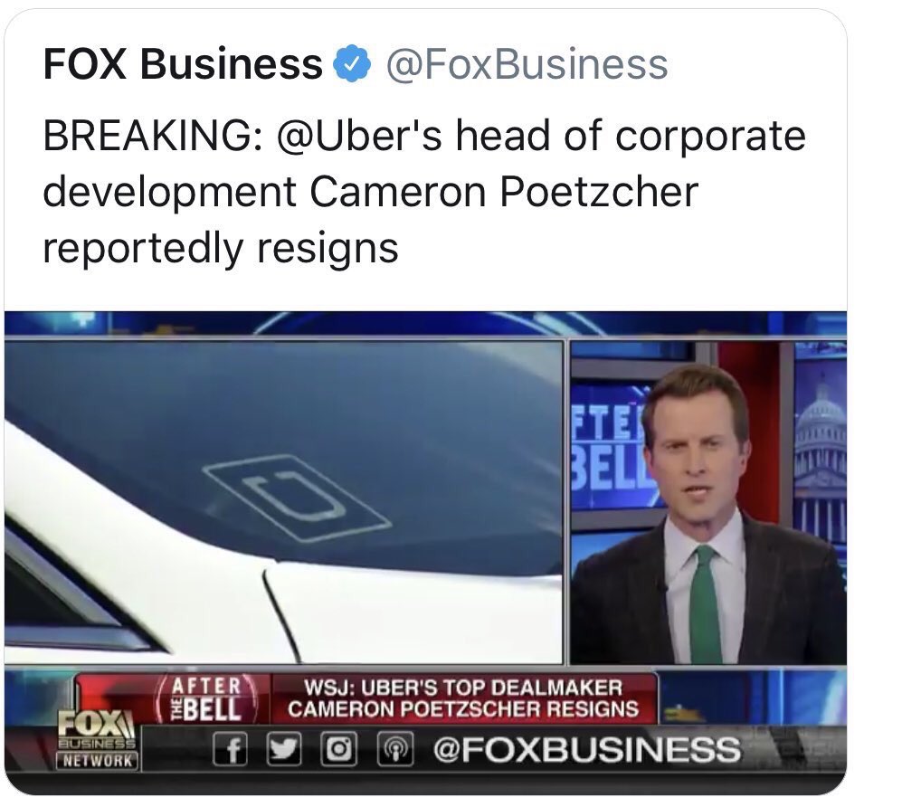 قالت قناة فوكس نيوز: إن رئيس تطوير المؤسسات في شركة أوبر، كاميرون بوتشر، قدم استقالته.