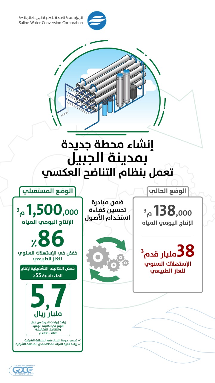 وأضاف أن مشروع محطة تحلية الجبيل سيزيد الإنتاج اليومي للمياه المحلاة بمحطة الإنتاج رقم “1” من 138 ألف متر مكعب يومياً ليصبح 400 ألف متر مكعب يومياً وبذلك يكون الإنتاج الكلي لمحطة الجبيل 1.500 مليون متر مكعب يومياً. وسيحقق خفض في الاستهلاك السنوي للغاز الطبيعي بنسبة 86% من أصل 38 مليار قدم3 تمثل الاستهلاك الحالي، لافتاً إلى مساهمته في خفض التكاليف التشغيلية لإنتاج المياه بنسبة 55%، إلى جانب زيادة إيرادات الدولة بنحو 5.7 مليار ريال، جراء الوفر في تكاليف الوقود والتكاليف التشغيلية إلى 2030م.