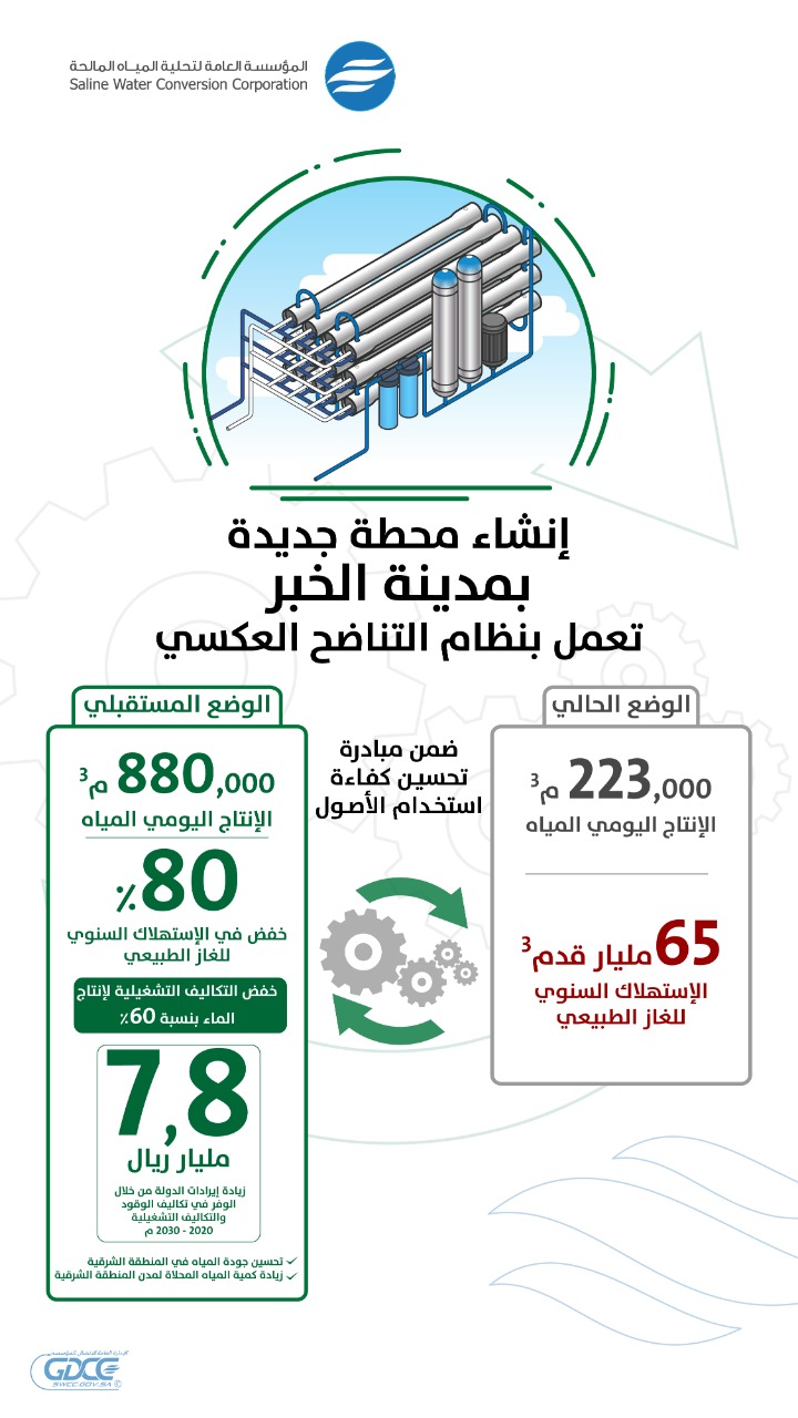 وكشف الحازمي أن مشروع محطة تحلية الخبر سيسهم في رفع الإنتاج اليومي للمياه المحلاة بمقدار 600 ألف متر مكعب يومياً، ليصبح الإنتاج الكلي لمحطة تحلية الخبر 880 ألف متر مكعب يومياً. وسيحقق خفضاً في الاستهلاك السنوي للغاز الطبيعي بنسبة 80% من أصل 65 مليار قدم3 تُمثل الاستهلاك الحالي. إضافةً إلى خفض التكاليف التشغيلية لإنتاج المياه المحلاة بنسبة 60%، وزيادة إيرادات الدولة بنحو 7.8 مليار ريال جراء الوفر في تكاليف الوقود والتكاليف التشغيلية إلى “2030م”.