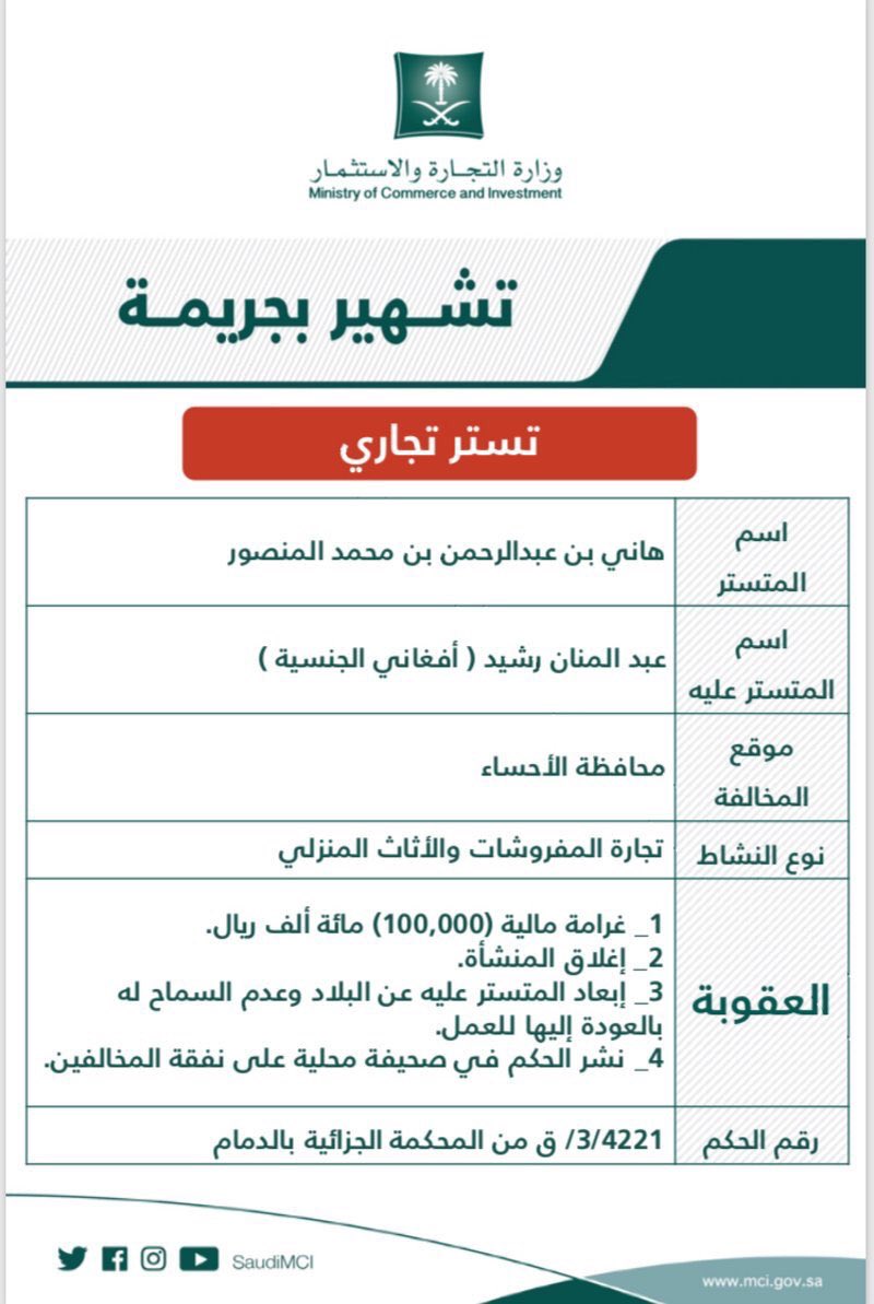 شهرت وزارة التجارة والاستثمار بمواطن ومقيم من جنسية آسيوية وذلك بعد صدور حكم قضائي بإدانتهما بجريمة التستر التجاري وثبوت تمكين المواطن للمقيم من العمل لحسابه الخاص ومزاولة نشاط التجارة في المفروشات والأثاث المنزلي بمحافظة الأحساء.