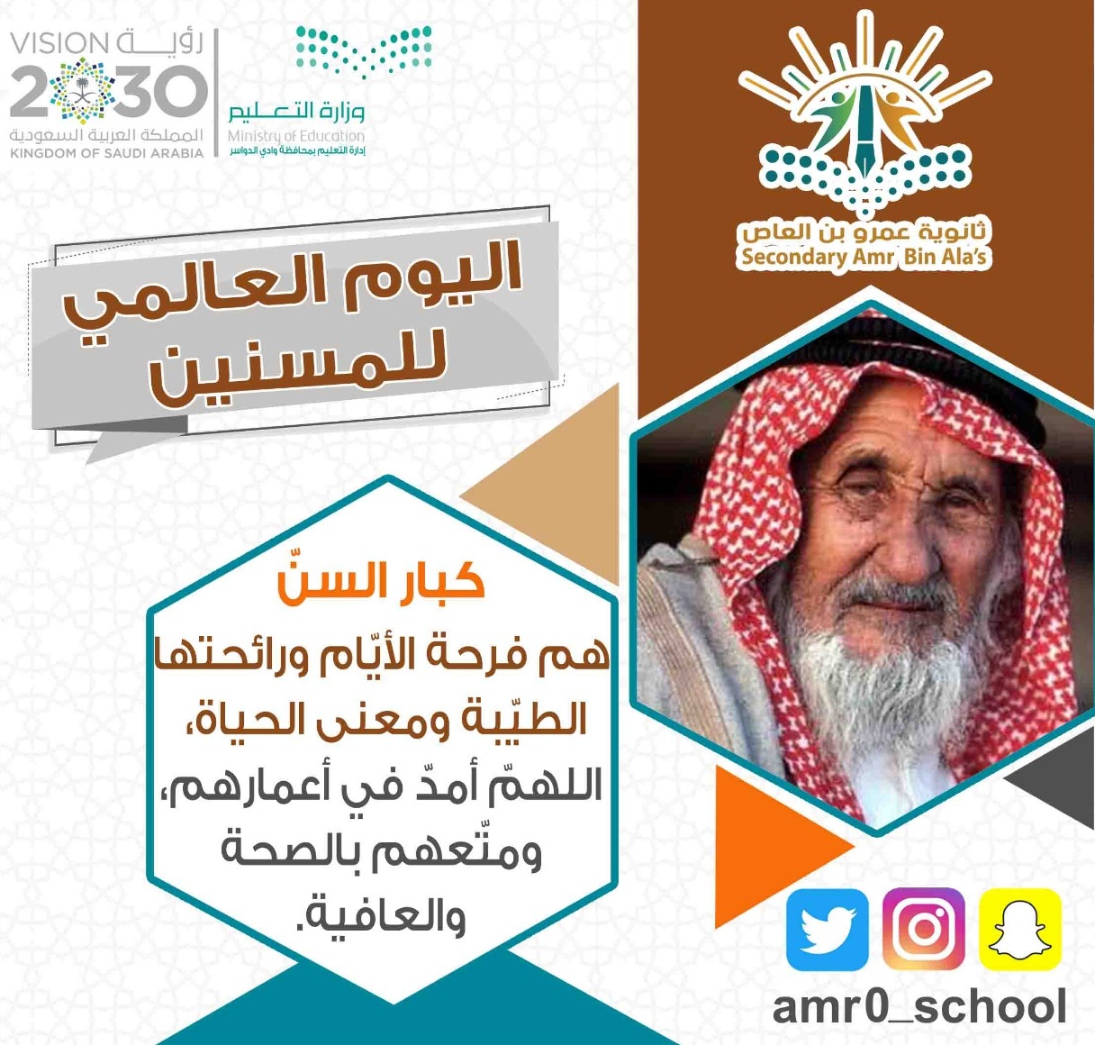 شاركت وزارة التعليم في الاحتفاء باليوم العالمي للمسنين، وذلك انطلاقاً من الدور التعليمي والتربوي لوزارة التعليم الذي يسهم في غرس القيم والمبادئ في نفوس الناشئة.