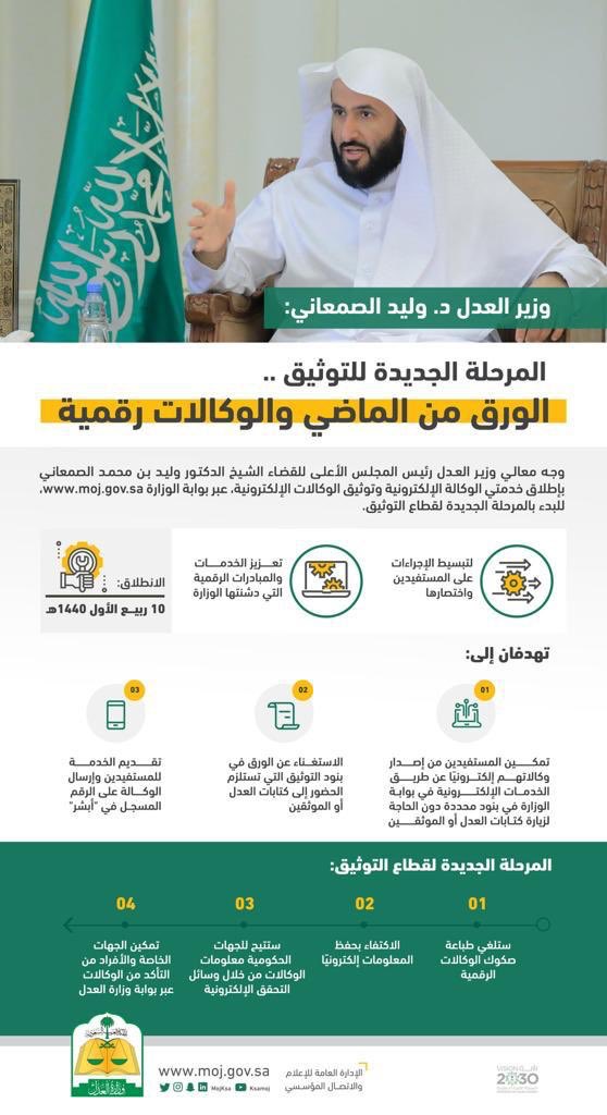وقال وزير العدل رئيس المجلس الأعلى للقضاء: إن الوزارة تعمل على التحول الرقمي الكامل للخدمات التوثيقية والأعمال القضائية، وتأتي خدمتا الوكالة الإلكترونية وتوثيق الوكالات إلكترونياً، لتعززا من سلسلة الخدمات والمبادرات الرقمية السابقة التي دشنتها الوزارة، وقد تحقق بها بفضل الله العديد من المنجزات العدلية في إطار التحول الإلكتروني الكامل للخدمات المقدمة للمستفيدين، مما يدعم تحقيق العدالة الناجزة وتبسيط الإجراءات على المستفيدين، حيث نعتبر راحة المستفيد واختصار الإجراءات وتبسيطها له أهم مستهدفاتنا.