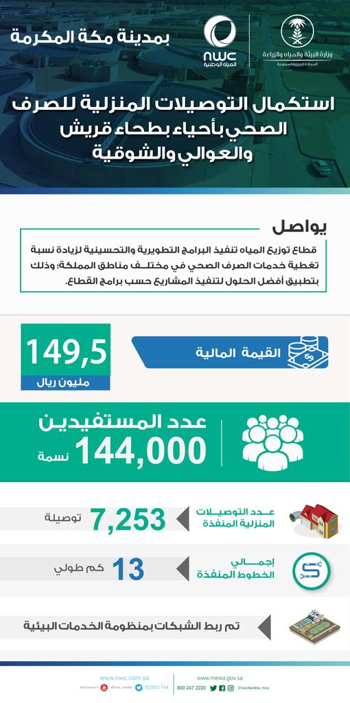 دشنت شركة المياه الوطنية عدد من مشاريع التوصيلات المنزلية الخاصة بالصرف الصحي التي نفذتها مؤخراً في عدد من أحياء مكة المكرمة ضمن استراتيجيتها لتلبية احتياج المواطنين وتحسين مستوى الخدمات المقدمة لهم، وذلك بحضور مدير عام المياه بمنطقة مكة المكرمة المهندس محمد بن صالح الغامدي، وعدد من أهالي وسكان الأحياء.