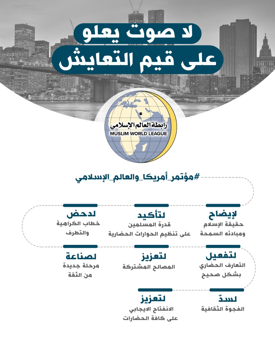 تنظم رابطة العالم الإسلامي مؤتمر التواصل الحضاري بين العالم الإسلامي وأمريكا، وذلك خلال الفترة من 4 إلى 5 أكتوبر 2018.