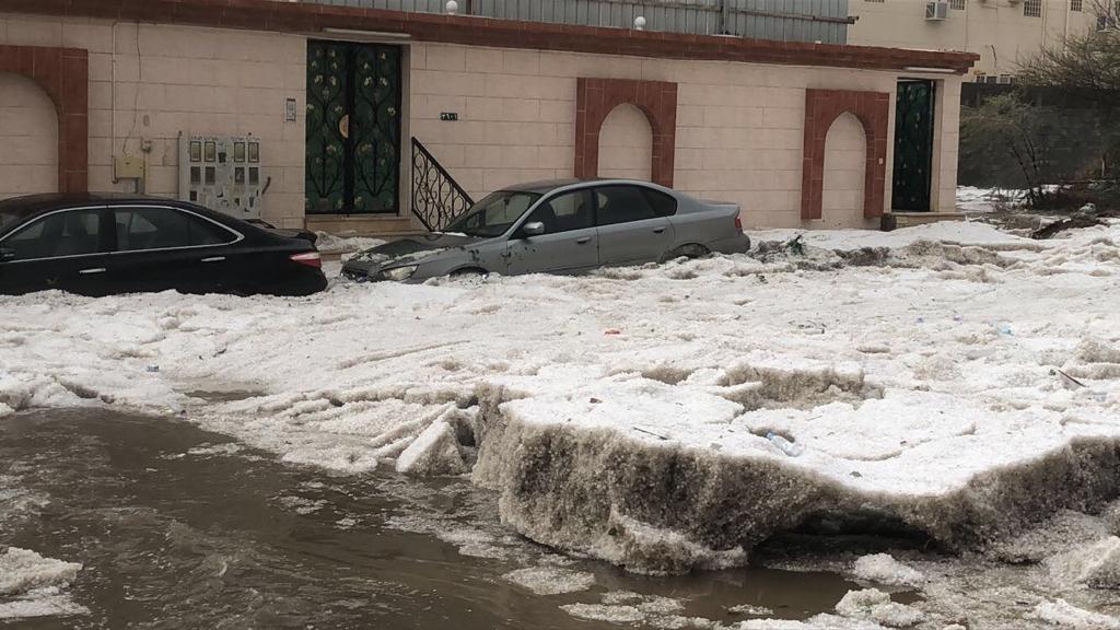 وكانت الأمطار أكثر غزارة على شمال محافظة الطائف، مصحوبة بزخات من البرد والتي حولت الشوارع والميادين إلى البياض، فيما وصل ارتفاع كميات البرد في بعض الأحياء إلى ما يقارب المتر.