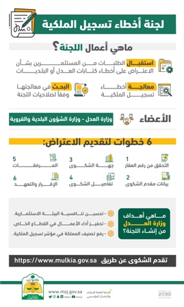 يذكر أن لجنة أخطاء تسجيل الملكية شكلت بناء على توصية من اللجنة التنفيذية لتحسين أداء الأعمال في القطاع الخاص “تيسير”، التي أنشئت بقرار من ولي العهد رئيس مجلس الشؤون الاقتصادية والتنمية صاحب السمو الملكي الأمير محمد بن سلمان بن عبد العزيز آل سعود -حفظه الله-، على أن تمارس اللجنة مهامها مستقلة عن وزارتي العدل والبلدية وترتبط مباشرة بوزير العدل معالي الشيخ الدكتور وليد بن محمد الصمعاني.