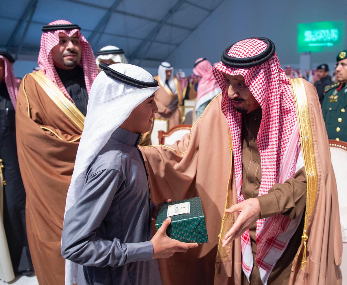وفي ختام الحفل تسلم خادم الحرمين الشريفين الملك سلمان بن عبدالعزيز آل سعود – أيده الله – هدية تذكارية ، تشرف بتقديمها صاحب السمو الملكي الأمير فيصل بن خالد بن سلطان بن عبدالعزيز أمير منطقة الحدود الشمالية.