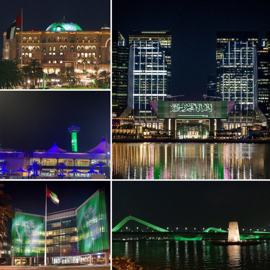 تزينت أبو ظبي باللون الأخضر احتفاء بزيارة ولي العهد الأمير محمد بن سلمان، نائب رئيس مجلس الوزراء، وزير الدفاع، في جولة تشمل العديد من البلدان العربية.