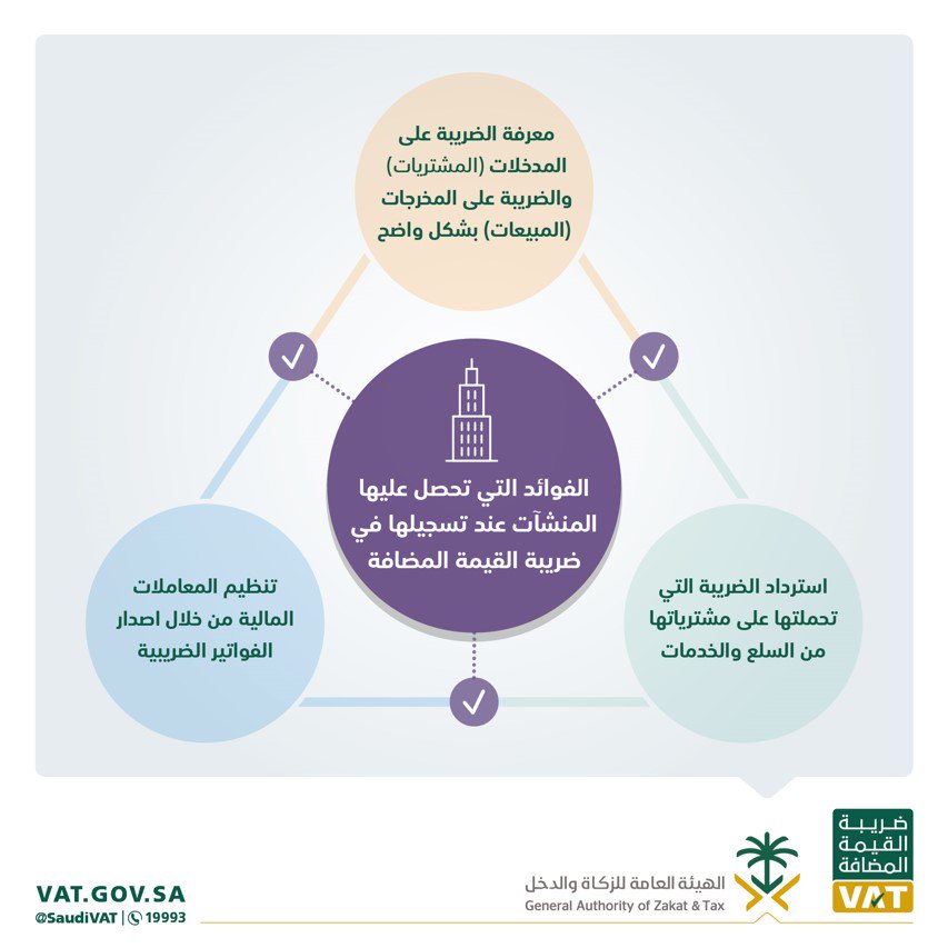 وأوضح حساب القيمة المضافة على “تويتر”، ثلاث فوائد تعود على المنشآت عند تسجيلها في ضريبة القيمة المضافة، ومنها معرفة الضريبة على المدخلات والمبيعات، وكذلك تنظيم المعاملات المالية، وأيضًا استرداد الضريبة التي تحملتها المنشأة على السلع والخدمات.