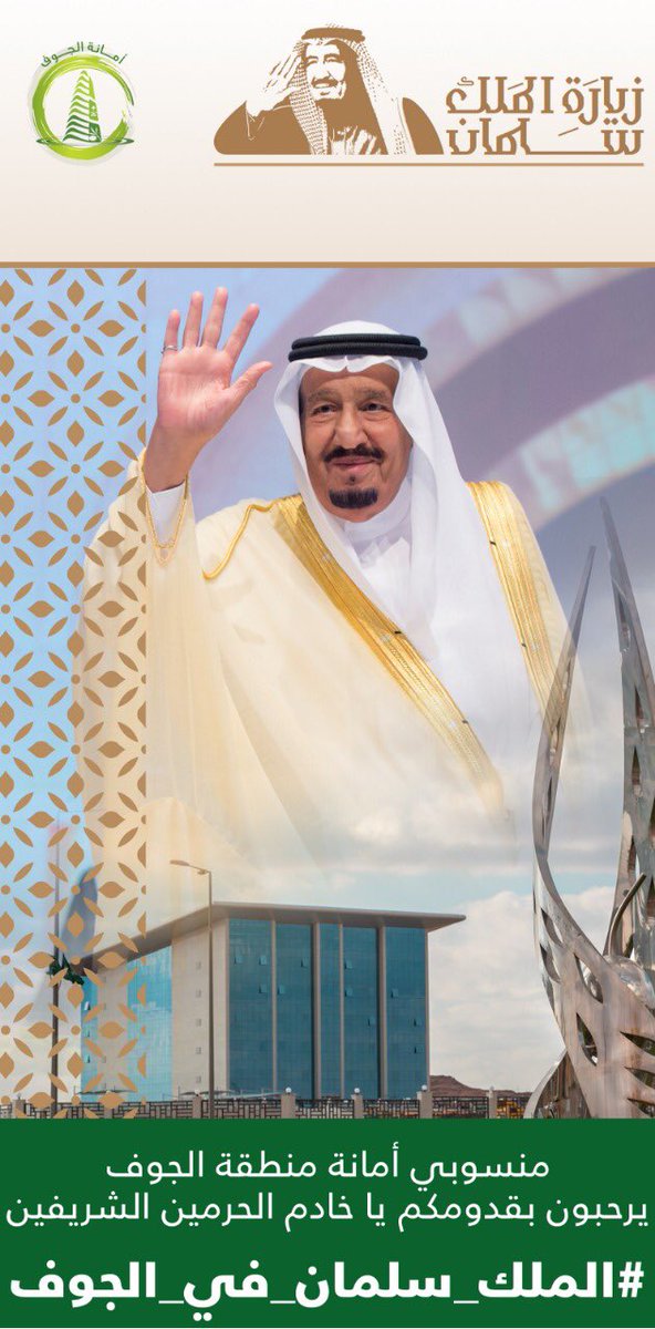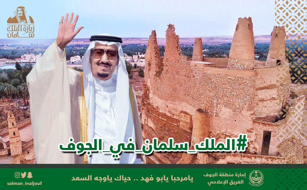 وكانت إمارة منطقة الجوف، قد أطلقت في وقت سابق، الهوية الرسمية لزيارة خادم الحرمين الشريفين الملك سلمان بن عبدالعزيز، للمنطقة، بعد جولته الخارجية التي شملت حائل والقصيم وحاليا منطقة تبوك.
