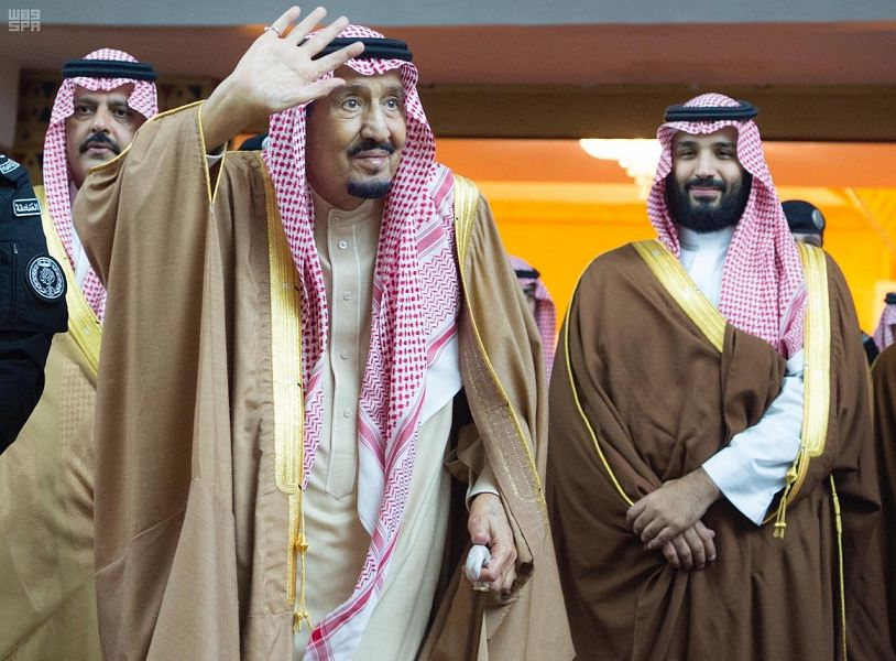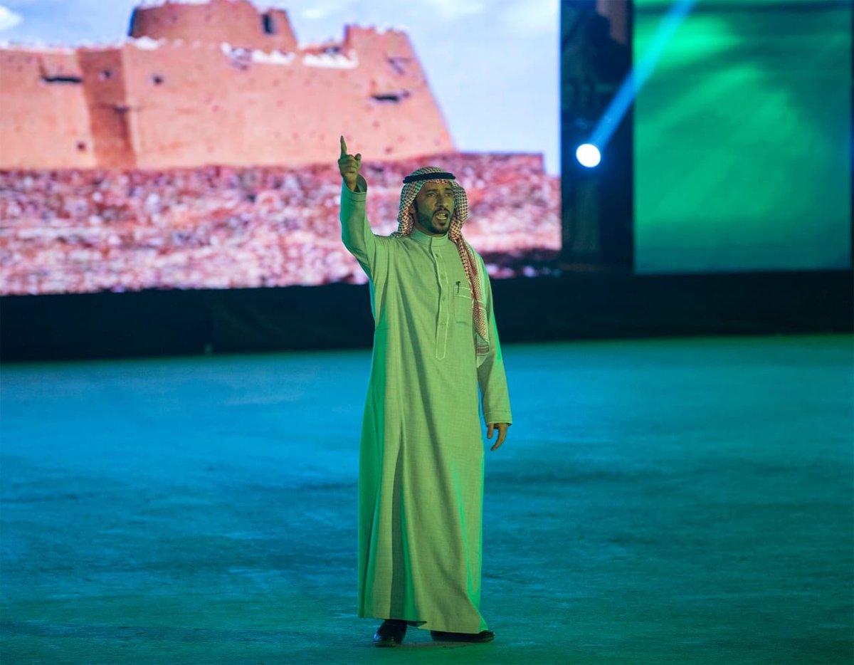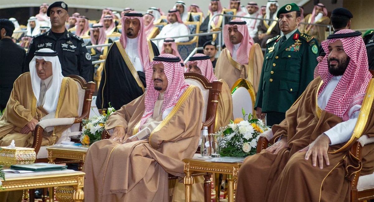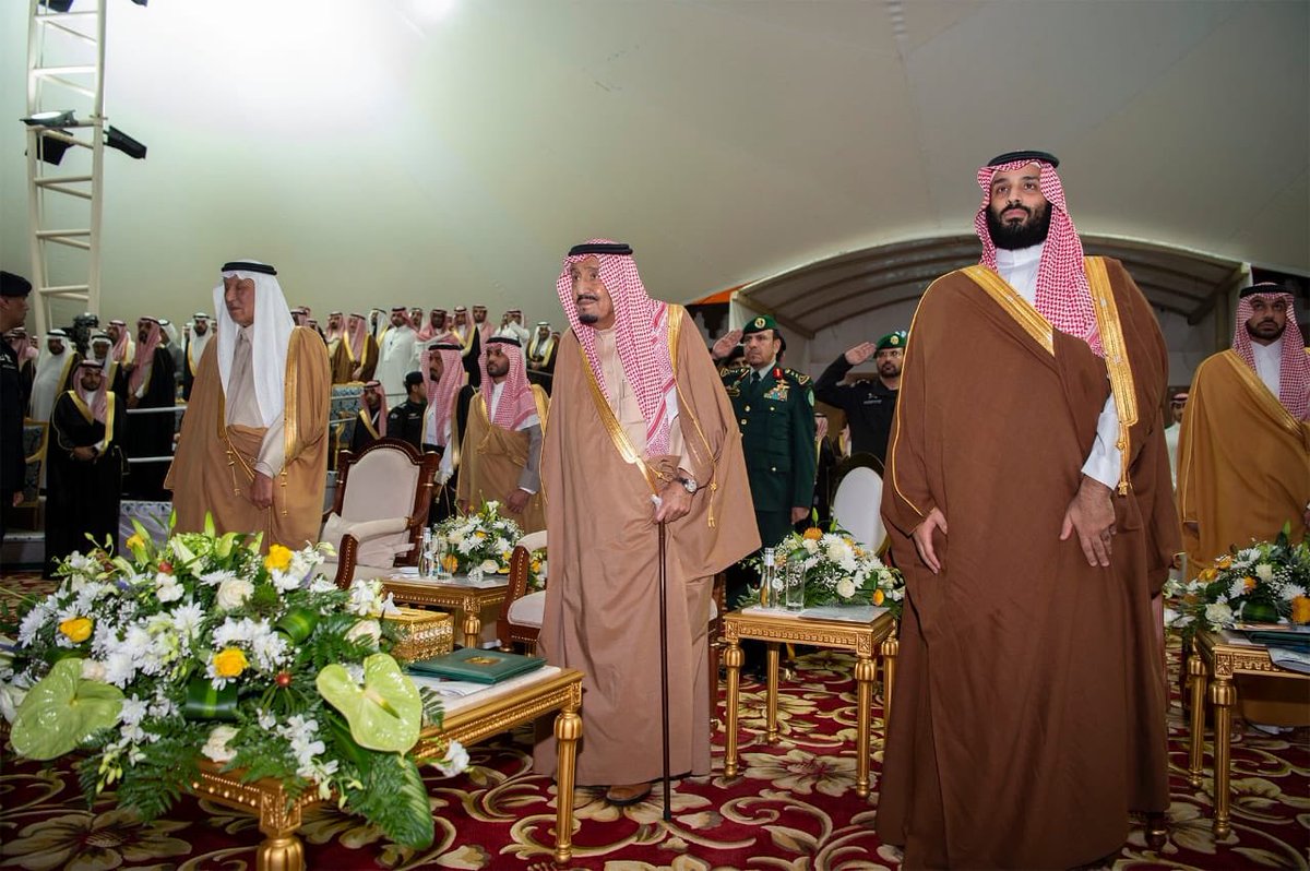 وعقب أن أخذ خادم الحرمين الشريفين الملك سلمان بن عبدالعزيز آل سعود – حفظه الله – مكانه في المنصة الرئيسة للحفل قوبل بعاصفة ترحيبية من الأهالي ، وبادلهم – أيده الله – التحية ملوحاً بيده الكريمة لهم .