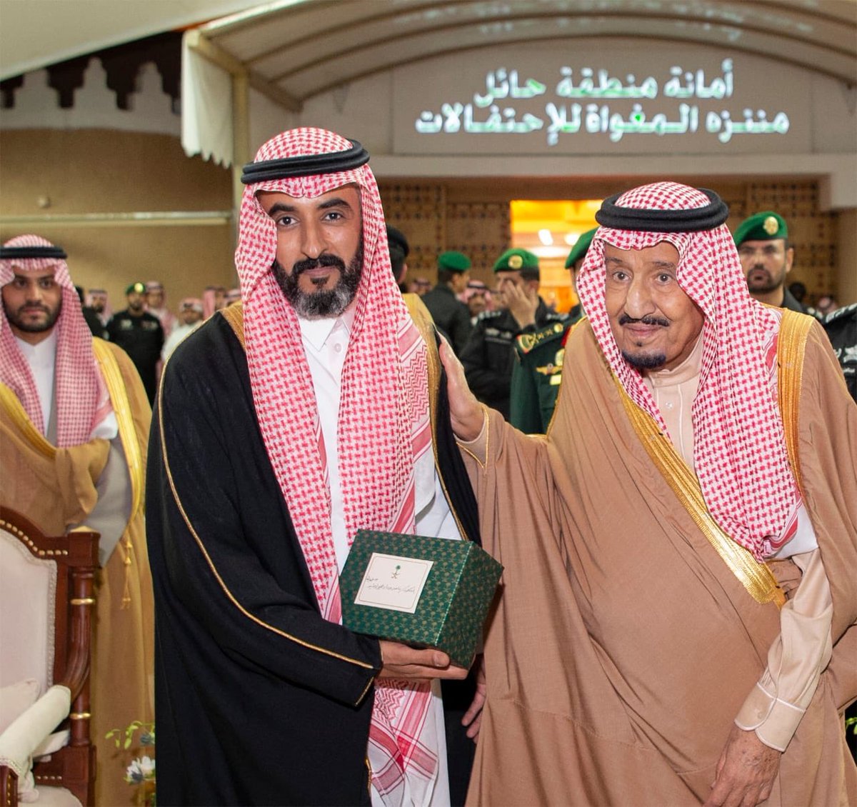 بعد ذلك تسلم خادم الحرمين الشريفين الملك سلمان بن عبدالعزيز آل سعود – أيده الله – هدية تذكارية تشرف بتقديمها صاحب السمو الملكي الأمير عبدالعزيز بن سعد بن عبدالعزيز أمير منطقة حائل .