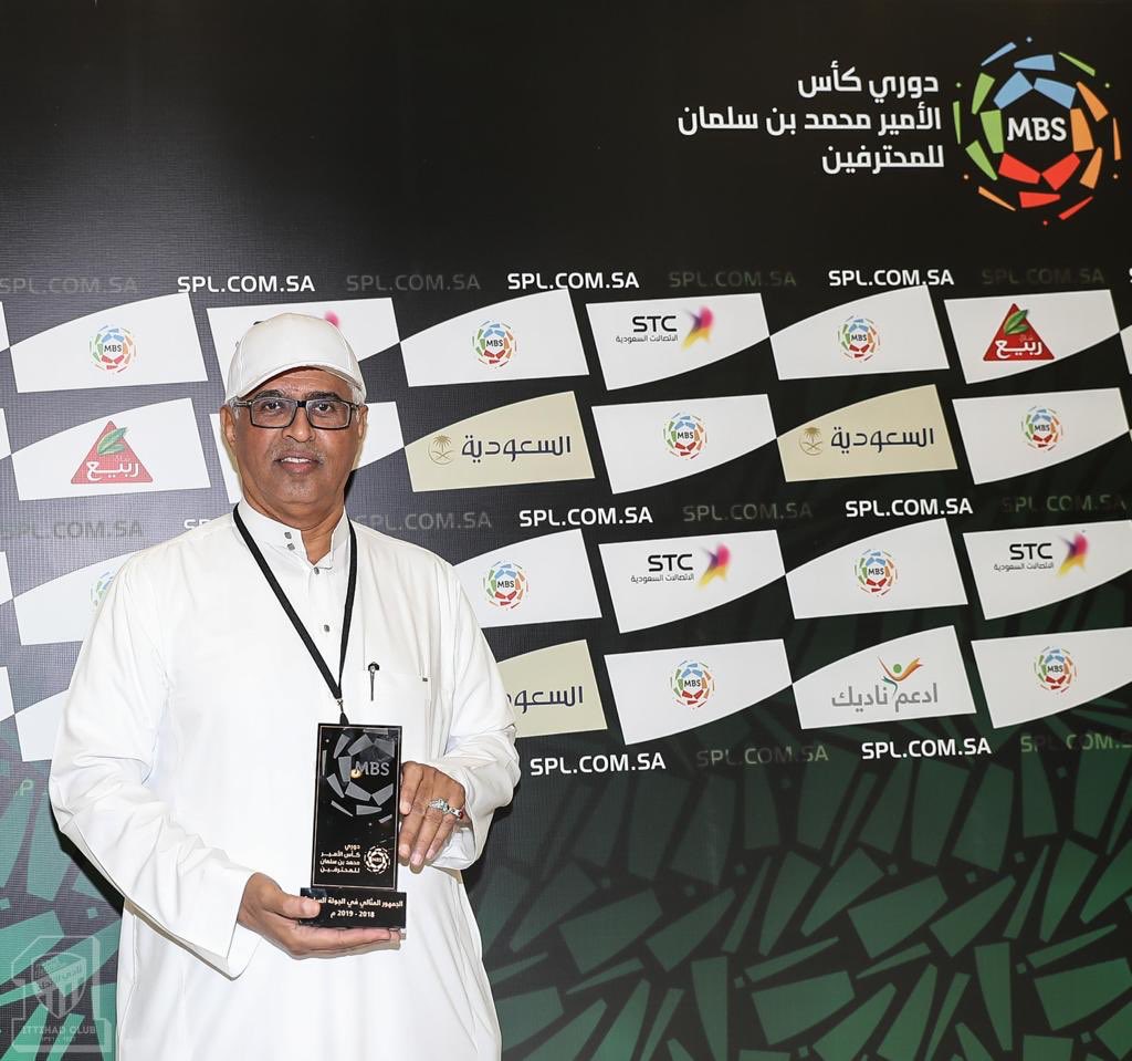 ونشر حساب نادي الاتحاد الرسمي عبر موقع التدوينات القصيرة “تويتر”، صورًا لرئيس رابطة مشجعي العميد أثناء تسلمه الجائزة، قبل انطلاق مباراة النمور أمام الرائد اليوم.