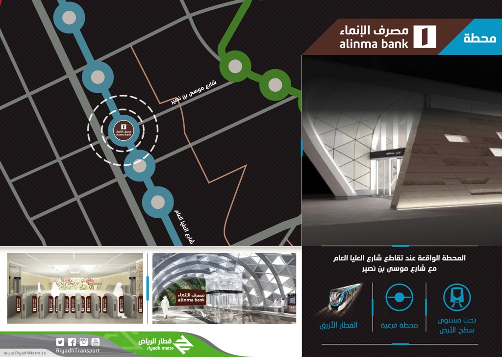 5. مصرف الإنماء فاز بمزايدة حقوق تسمية المحطة الواقعة عند التقاء شارع العليا مع شارع موسى بن نصير، على المسار الأول.