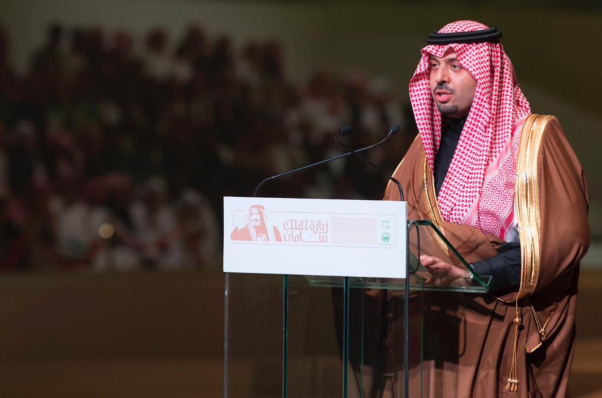 إثر ذلك ألقى صاحب السمو الملكي الأمير فيصل بن خالد بن سلطان بن عبدالعزيز أمير منطقة الحدود الشمالية، كلمةً بهذه المناسبة رحب في مستهلها باسمه ونيابة عن أهالي منطقة الحدود الشمالية كافة بالمقدم الميمون لخادم الحرمين الشريفين الملك سلمان بن عبدالعزيز آل سعود -حفظه الله- إلى منطقة الحدود الشمالية.