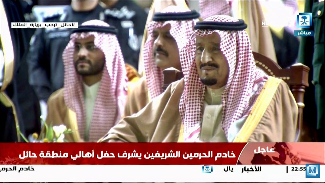 وعقب أن أخذ خادم الحرمين الشريفين الملك سلمان بن عبدالعزيز آل سعود- حفظه الله- مكانه في المنصة الرئيسة للحفل قوبل بعاصفة ترحيبية من الأهالي، وبادلهم- أيده الله- التحية ملوحًا بيده الكريمة لهم.