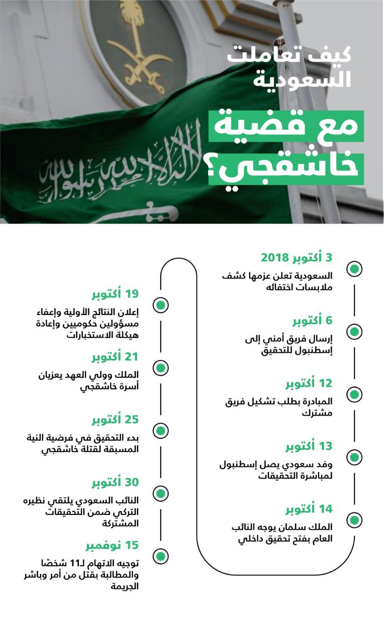 مراحل التحقيق ومباشرة النيابة العامة للقضية منذ 3 أكتوبر 2018 بإعلام المملكة عزمها الكشف عن ملابسات اختفاء الكاتب والصحفي خاشقجي، مرورا بمراحل التحقيق وجمع الأدلة والقرائن، وحتى يومنا هذا الخميس 15 نوفمبر، والذي تم خلاله الكشف عن آخر التطورات في القضية، بتوجيه الاتهام لـ11 شخصا والمطالبة بقتل من أمر وباشر الجريمة، يؤكد بما لا يدع مجالا للشك أن المملكة مهد العدالة والشفافية عازمة على انجلاء الحقيقة كاملة.