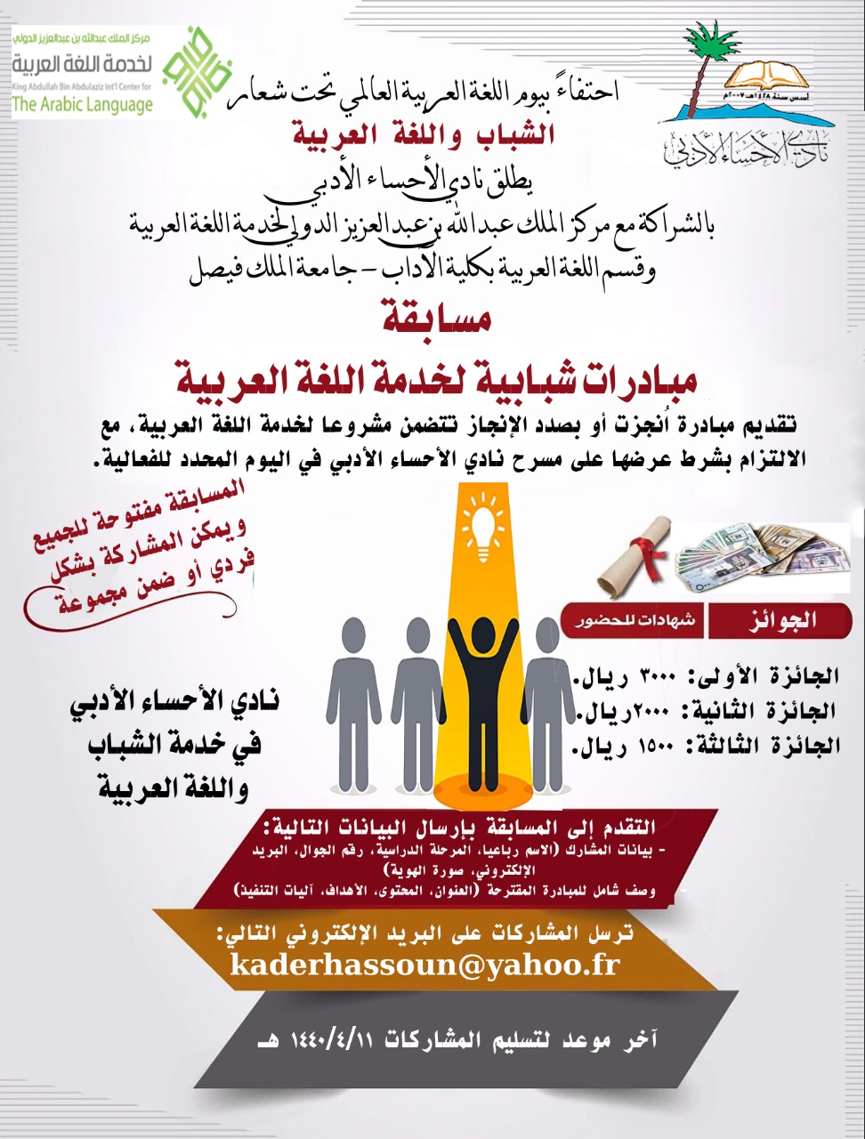 احتفاء بيوم اللغة العربية العالمي الذي يصادف الثلاثاء ١١ربيع الثاني ١٤٤٠هـ، الموافق ١٨ ديسمبر ٢٠١٨م الذي ركز هذا العام على الشباب واللغة العربية ، فقد أطلق أدبي الأحساء بالشراكة مع مركز الملك عبدالله بن عبدالعزيز الدولي لخدمة اللغة العربية وقسم اللغة العربية بكلية الآداب – جامعة الملك فيصل مسابقتين للشباب والشابات في مرحلتي التعليم العام والجامعي.