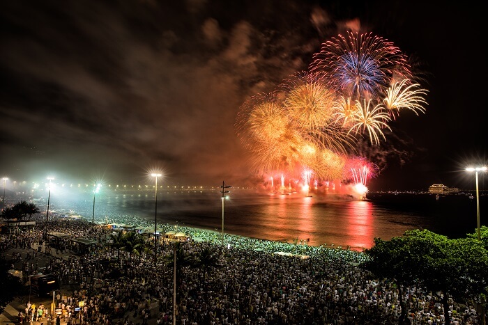 تقام العديد من الاحتفالات الكرنفالية عشية رأس السنة الجديدة، على ضفاف شاطئ كوباكابا الشهير، بمدينة ريو دي جانيرو، حيث استقبال ما يقرب من مليوني شخص على الرمال الممتدة لمسافة حوالي 2 كيلومتر ونصف، بالإضافة إلى العروض النارية وحفلات الرقص والألعاب النارية الملونة في منتصف الليل.