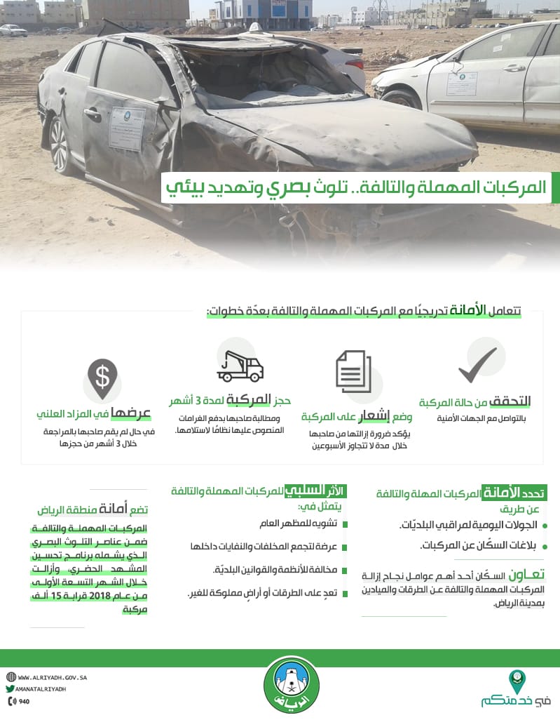 أكدت أمانة منطقة الرياض، اليوم الاثنين، أن المركبات المهملة والتالفة تمثل تلوثاً بصرياً وتهديداً للبيئة.