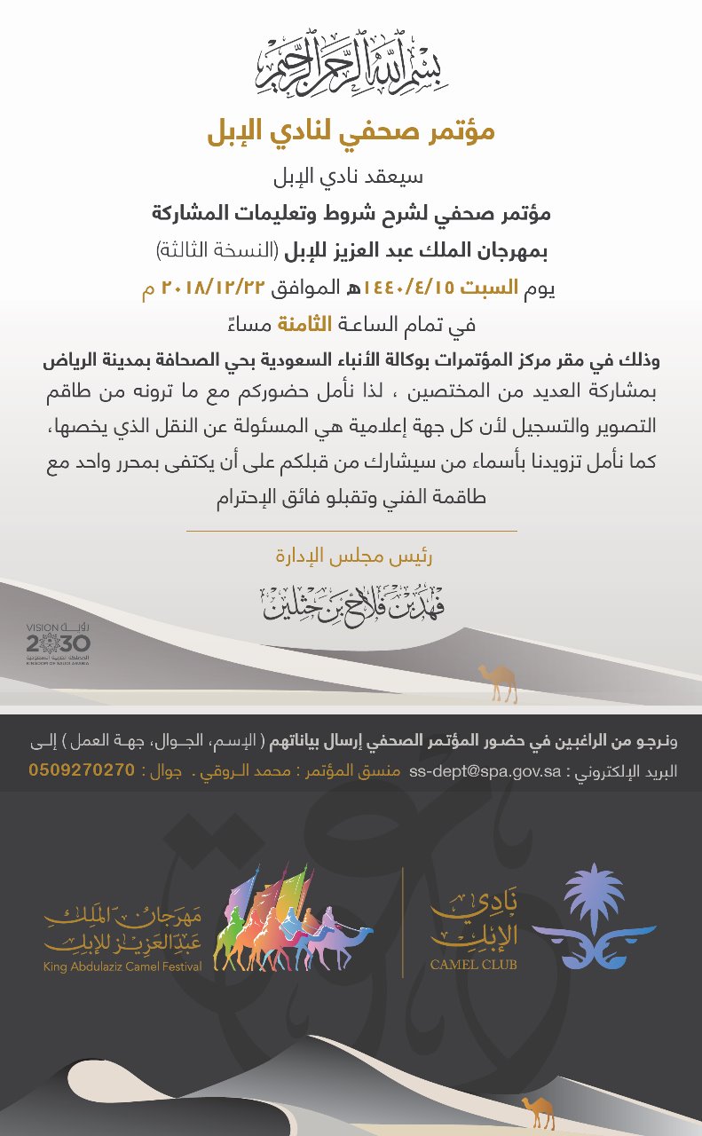 يعقد نادي الإبل مؤتمرًا صحفيًّا يوم السبت المقبل، لشرح شروط وتعليمات المشاركة بمهرجان الملك عبدالعزيز للإبل في نسخته الثالثة.