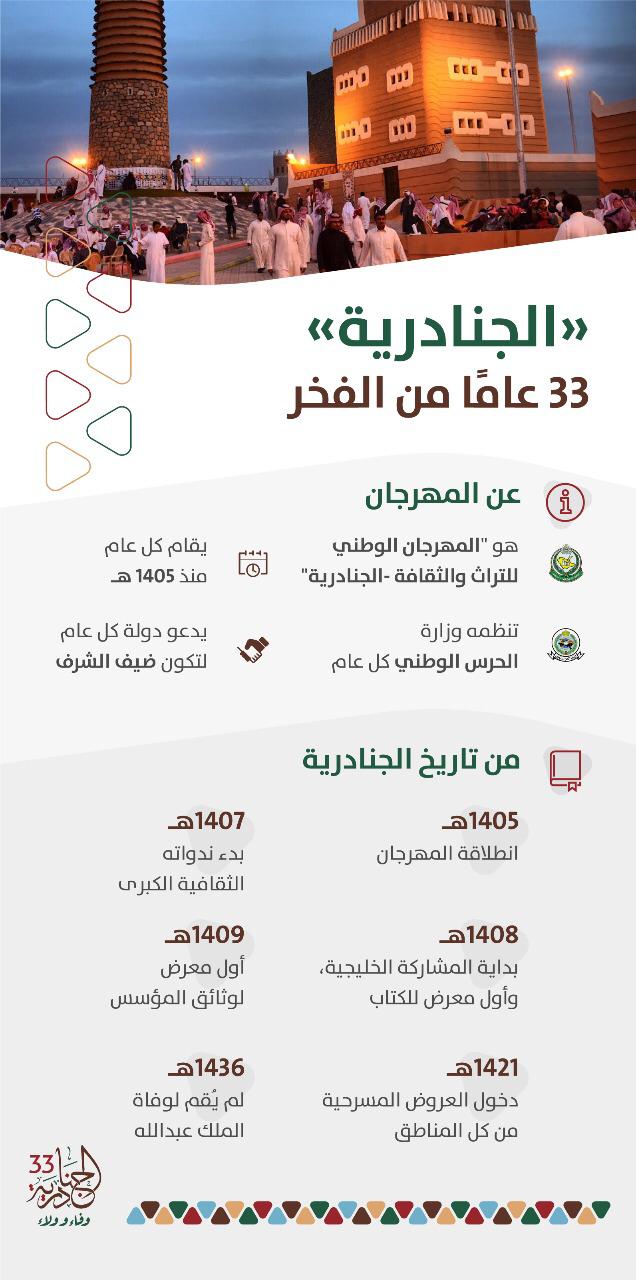 يذكر أن مهرجان الجنادرية هو المهرجان الوطني للتراث والثقافة ، ويقام كل عام منذ عام 1405هـ، وتنظمه وزارة الحرس الوطني كل عام، كما يتم دعوة دولة كل عام لتكون ضيف الشرف للمهرجان.