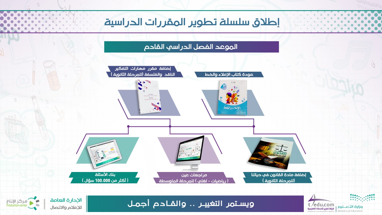وكانت وزارة التعليم بالتعاون مع شركة تطوير للخدمات التعليمية، والمؤسسات ذات الخبرة، أعلنت أول أمس إطلاق مجموعة من المناهج المقررة لمختلف المراحل الدراسية في مدارس التعليم العام، بدءًا من الفصل الدراسي الثاني، وكذلك العام الدراسي القادم.