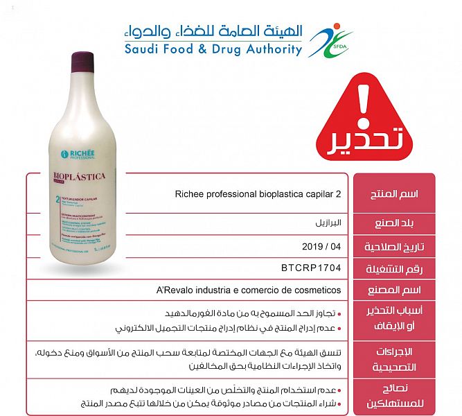 وأوضحت الهيئة، أنها جمعت وحللت عينات من منتجات فرد الشعر المتداولة بالأسواق المحلية للتأكد من سلامتها، وأظهرت نتائج التحليل احتواء 4 منتجات على نسبة عالية من مادة”فورمالدهيد” التي تسبب مخاطر صحية للمستهلك في حال تجاوزها الحدود المسموح بها في متطلبات السلامة بمستحضرات التجميل والعناية الشخصية رقم SFDA.CO/GSO 1943:2016 .