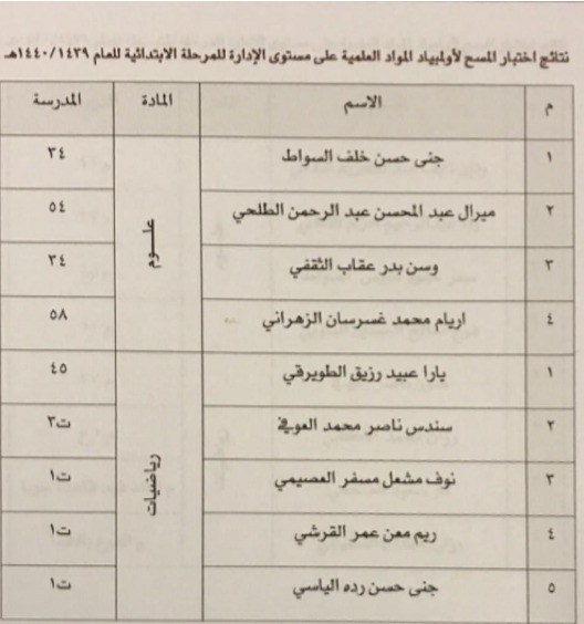 اعتمدت مساعدة المدير العام للشؤون التعليمية للبنات، مها بنت طاهر الزايدي، أسماء الطالبات في نتائج اختبار المسح لأولمبياد المواد العلمية في جميع الفروع على مستوى الإدارة في جميع المراحل الثلاث للعام 1439-1440.