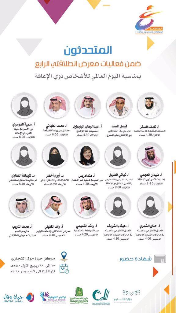 يذكر أن المعرض يضم فترتين الفترة الصباحية من الساعة 8 ــ 11، والفترة المسائية من 4 م ــ 10 م، وقد تم تخصيص الهاشتاق التالي للفعالية: #انطلاقتي4_للتربية_الخاصة.