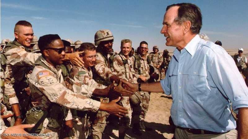 وفي 1990، أعلن “النظام العالمي الجديد”، وقاد حملة إخراج القوات العراقية من الكويت بعملية “عاصفة الصحراء”، لكنه رأى أن التدخل في الشرق الأوسط ينذر بفوضى قادمة.