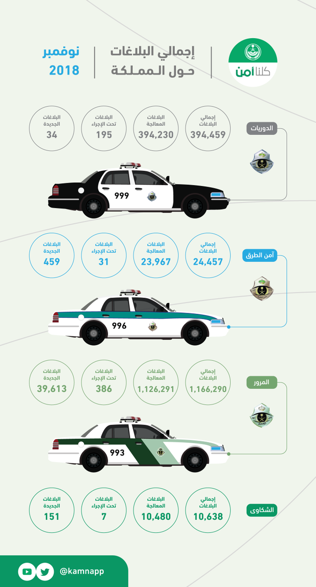 ولفت حساب تطبيق كلنا أمن إلى أنه تمت معالجة 394230 بلاغاً من التي تلقتها الدوريات الأمنية و195 تحت الإجراء، فيما عالجت 23967 بلاغاً لأمن الطرق وتحت الإجراء 31، و1126291 بلاغاً للمرور و386 تحت الإجراء.