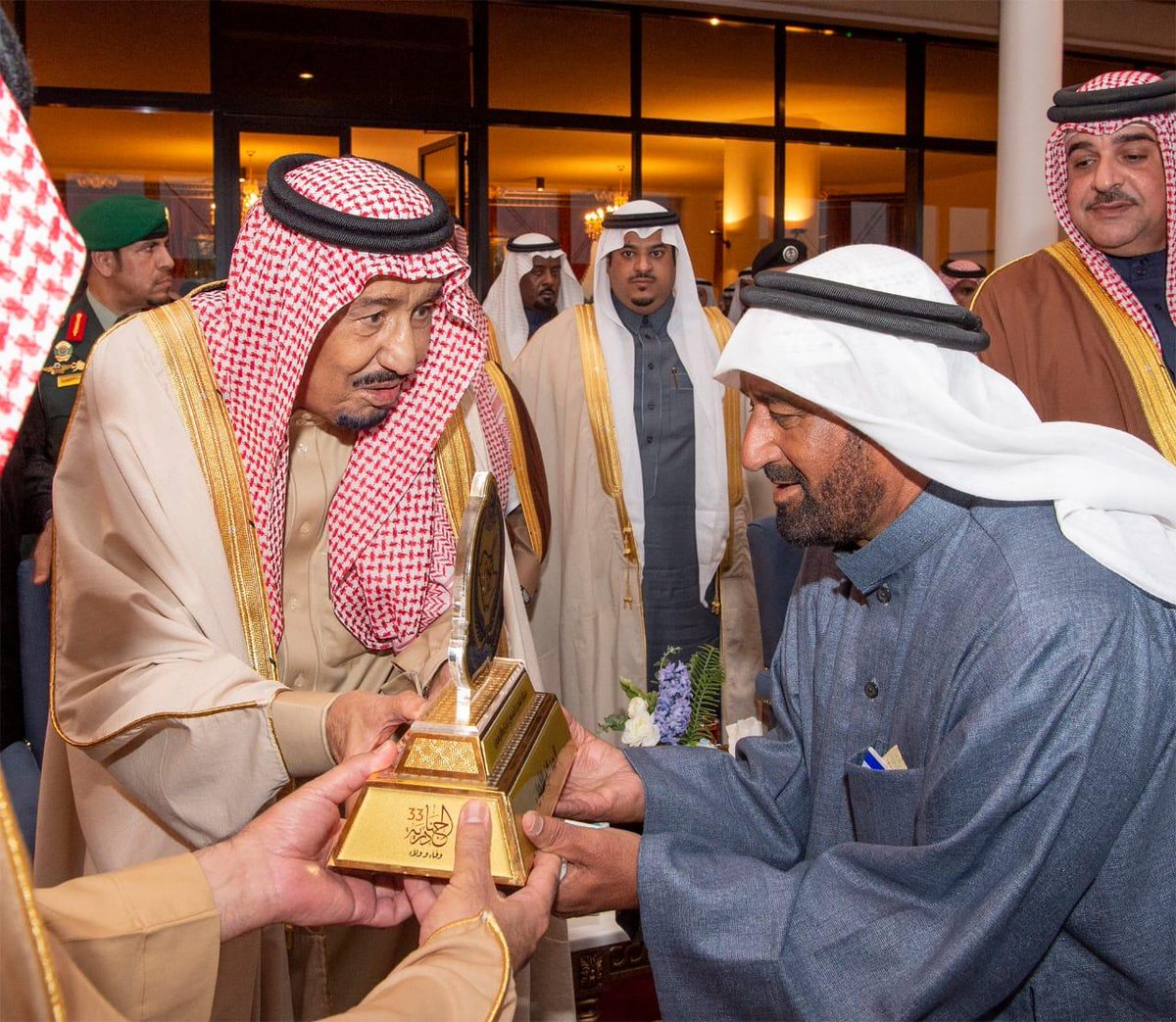 وبعد نهاية سباق الهجن السنوي الكبير، سلم خادم الحرمين الشريفين الملك سلمان بن عبدالعزيز آل سعود – حفظه الله -، الجوائز للفائزين الخمسة الأوائل في السباق.