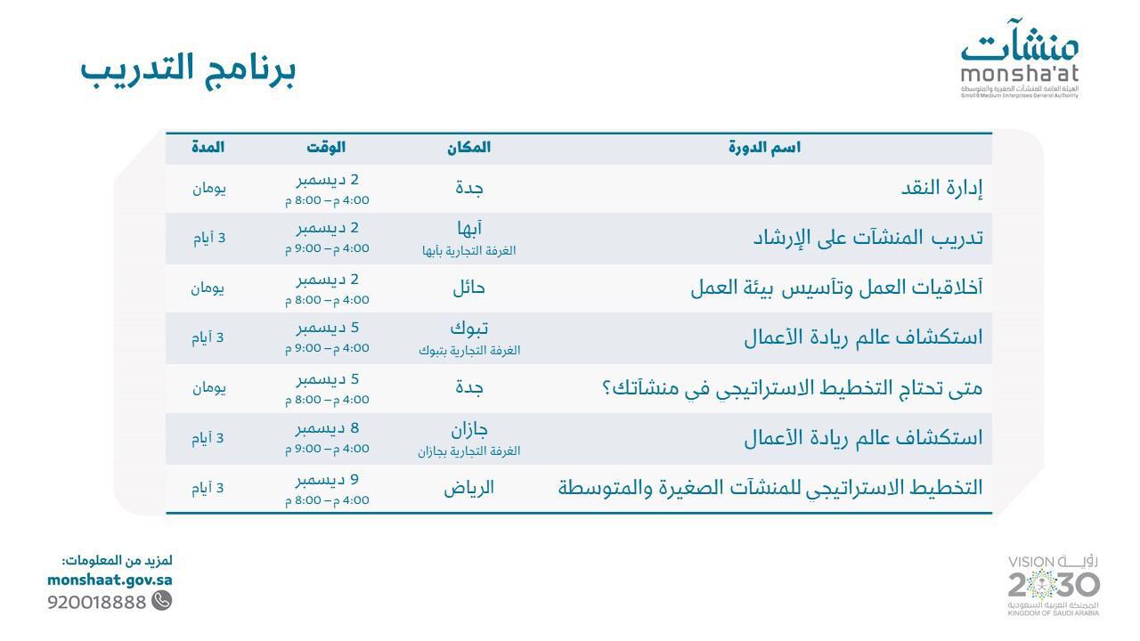 وقالت منشآت، في تغريدة عبر حسابها اليوم، “تبدأ من يوم غدٍ برامج منشآت التدريبية لأول أسبوعٍ من ديسمبر في عددٍ من مناطق المملكة، موضحة أن مقاعد الحضور محدودة.
