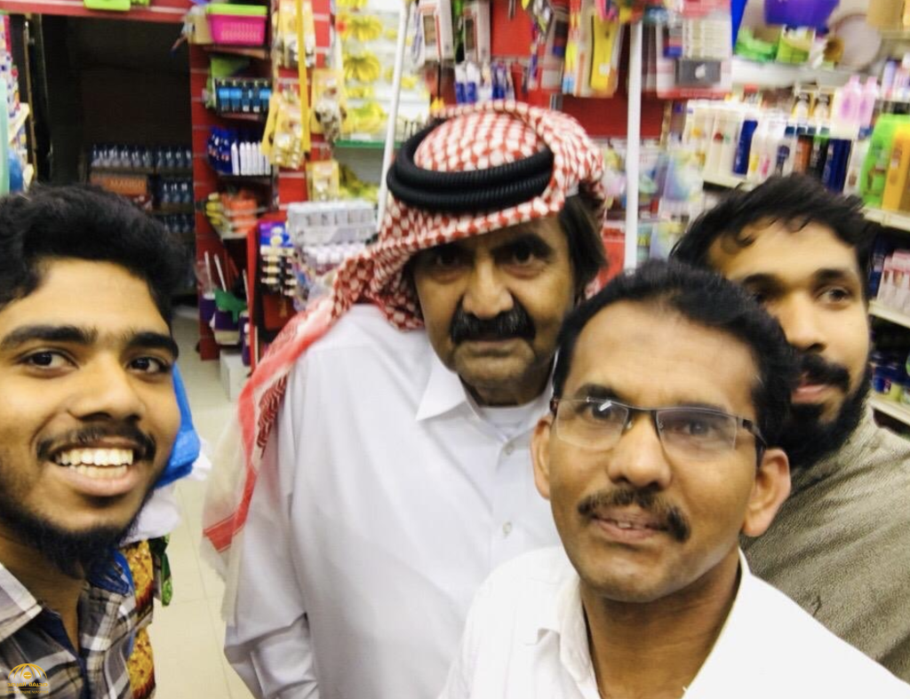 ظهر حمد بن خليفة آل ثاني أمير قطر السابق، وحيداً، داخل بقالة يلتقط صور سيلفي مع مقيمين من الجالية الهندية كانوا متواجدين في المحل جنوب الدوحة.