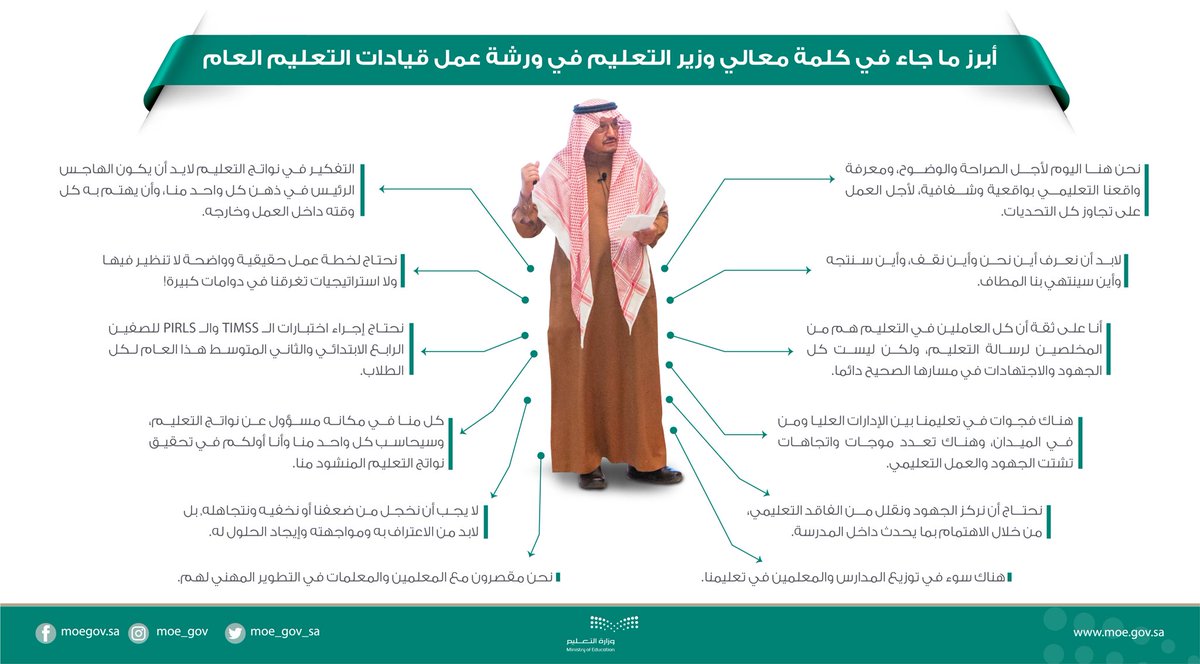 وكان أبرز ما جاء في كلمة وزير التعليم في ورشة عمل قيادات التعليم العام ما يلي: