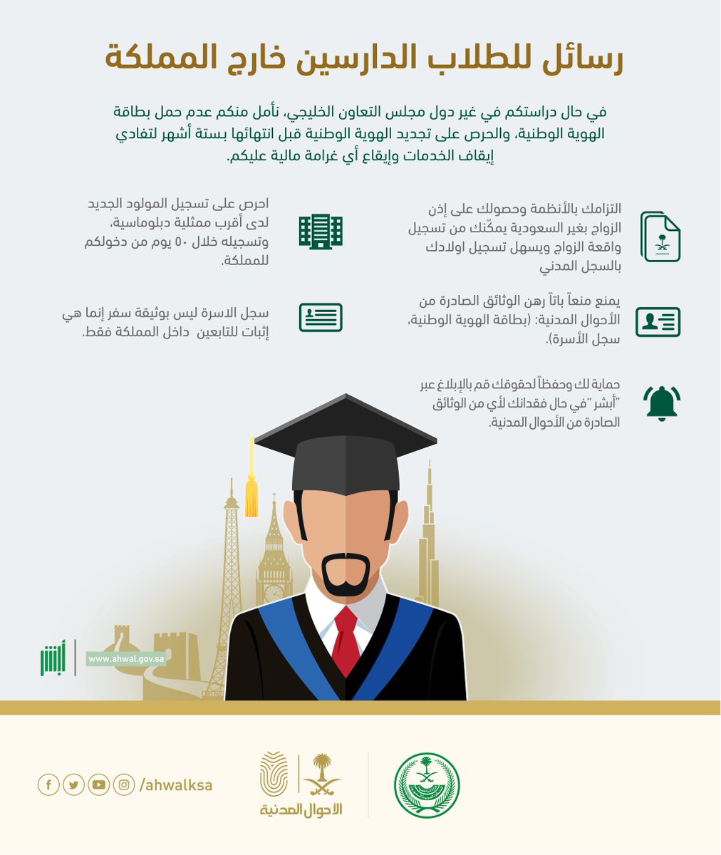 نبهت وكالة وزارة الداخلیة للأحوال المدنیة المواطنین الدارسین خارج المملكة إلى عدد من الأنظمة والتعلیمات؛ تفادياً لإيقاف خدماتهم أو توقیع غرامات مالیة بحقهم.